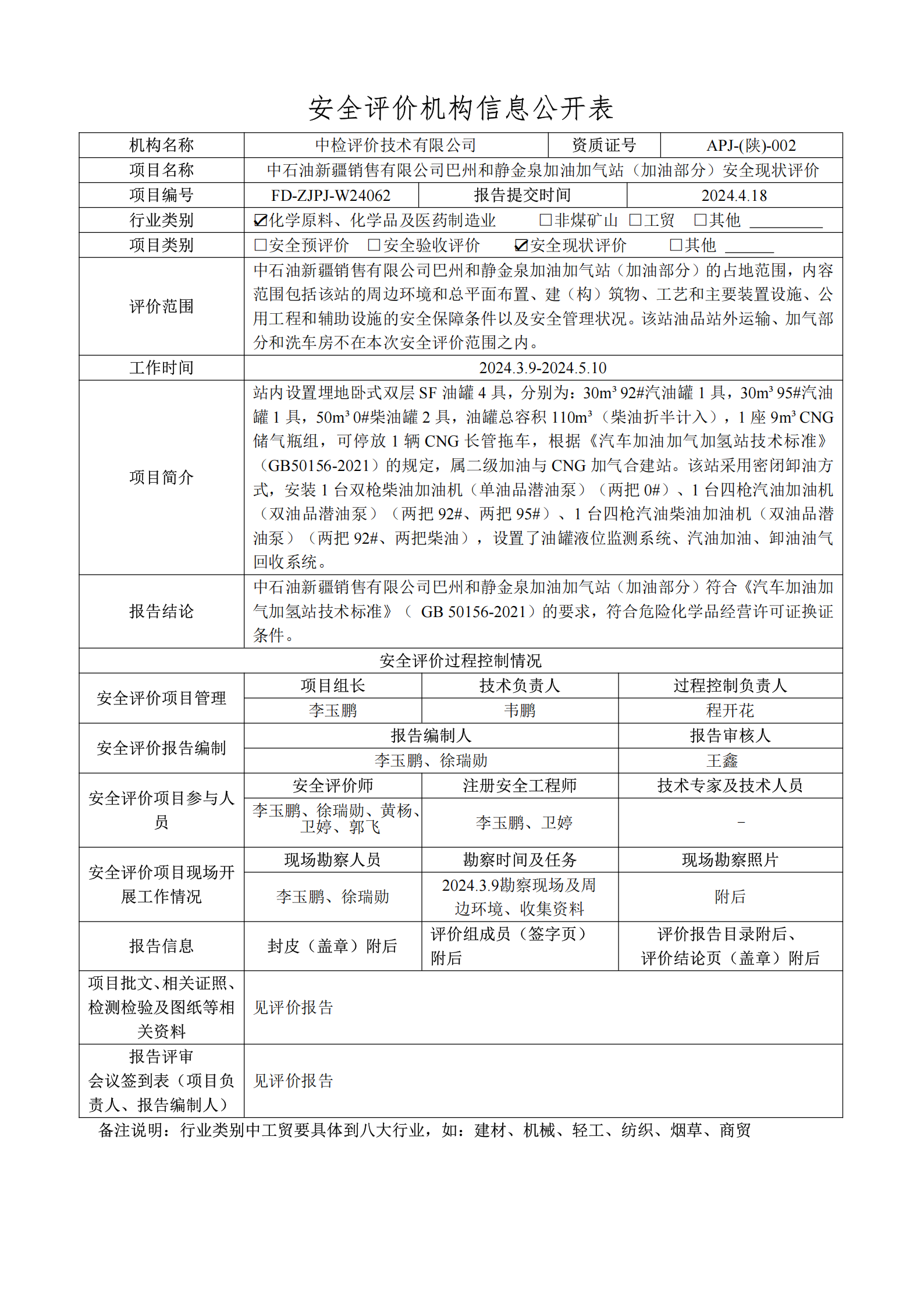 中石油新疆销售有限公司巴州和静金泉加油加气站(加油部分)安全现状评价报告
