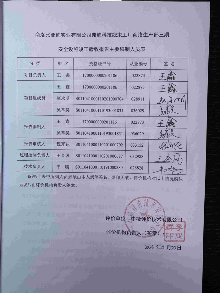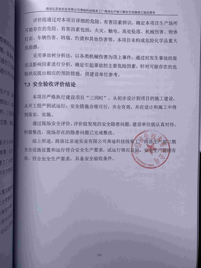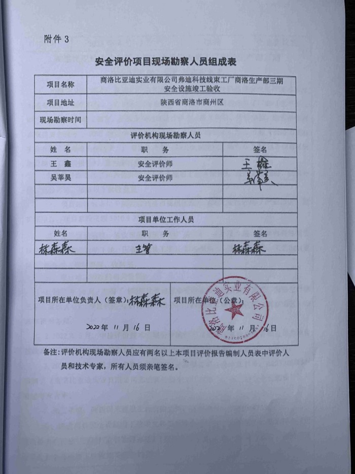 项目名称 | 商洛比亚迪实业有限公司弗迪科技线束工厂商洛生产部三期安全设施竣工验收 | ||||||