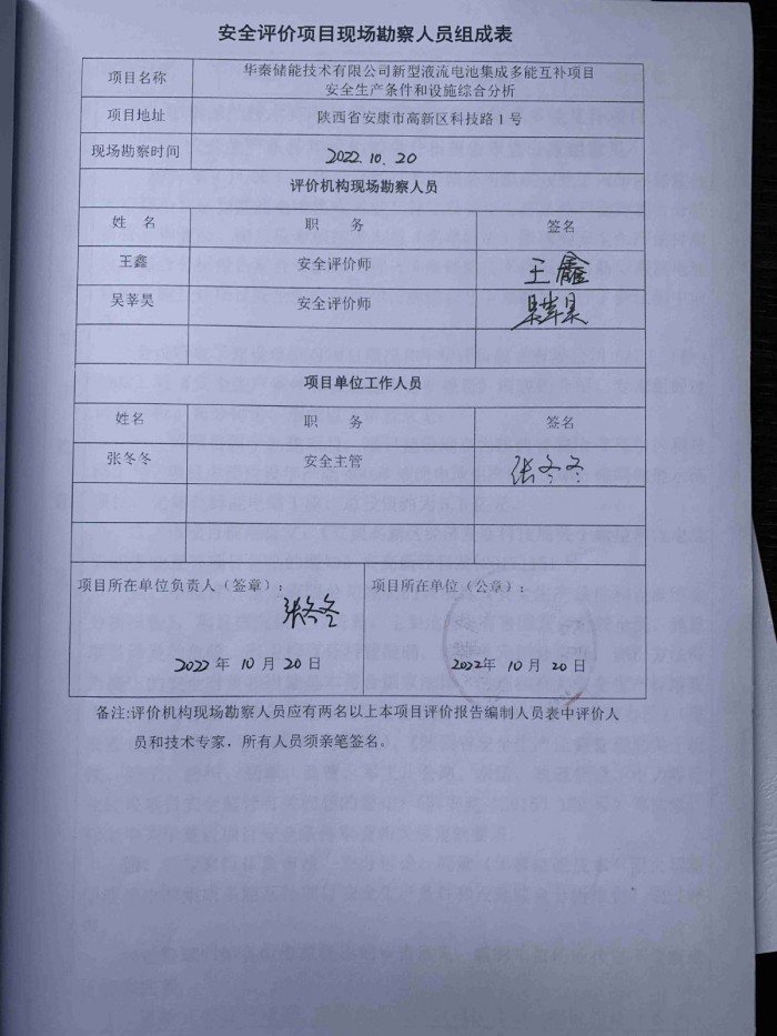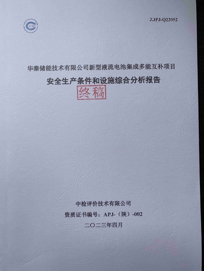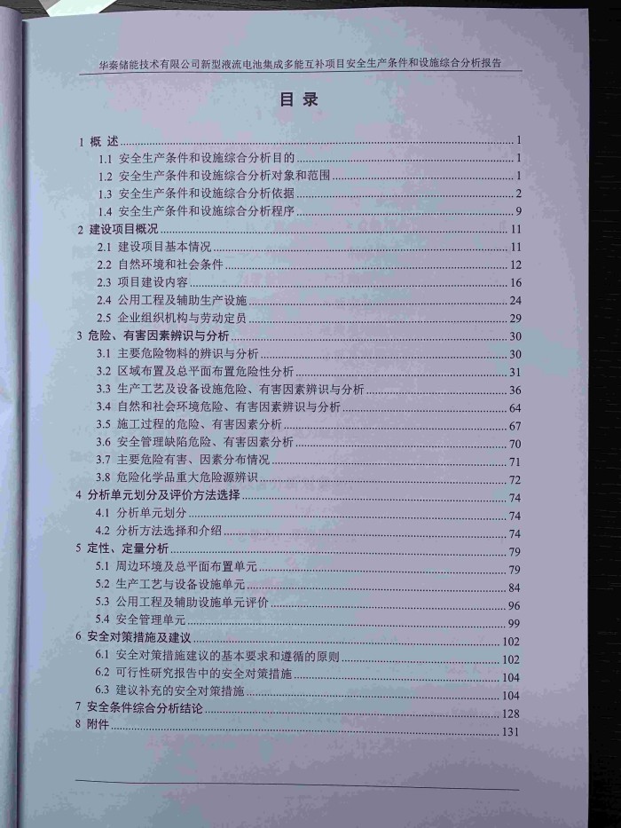 项目名称 | 华秦储能技术有限公司新型液流电池集成多能互补项目 安全生产条件和设施综合分析报告 | ||||||