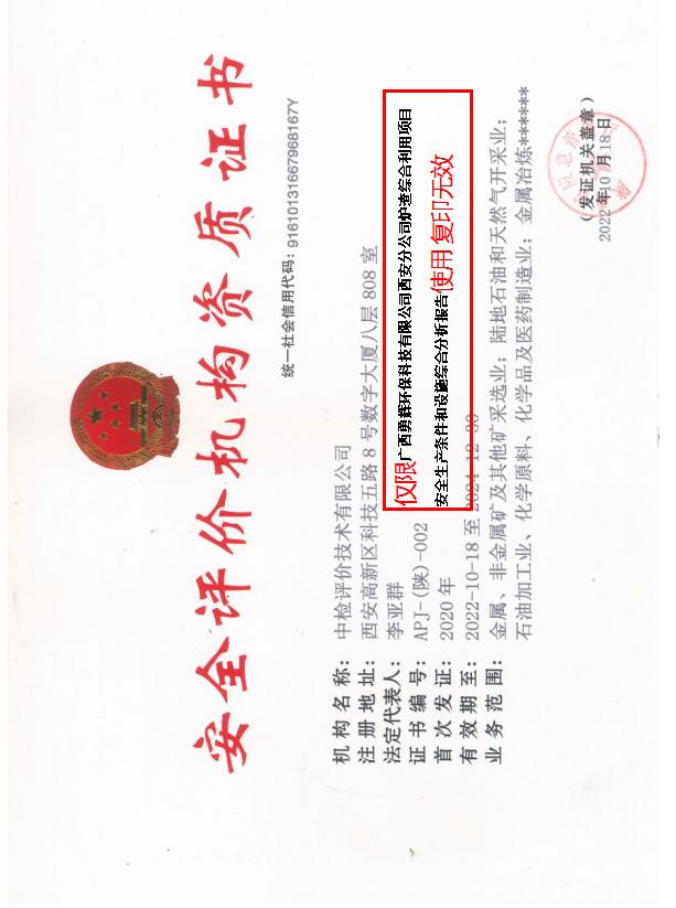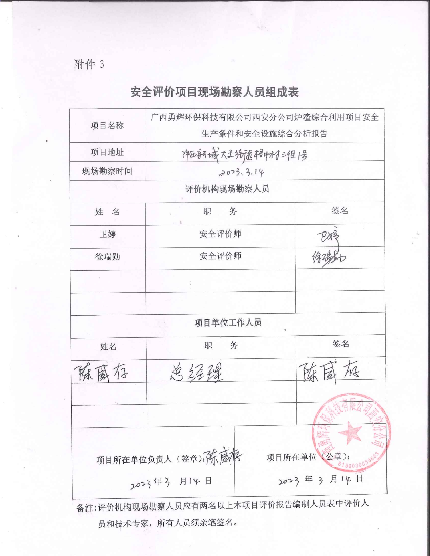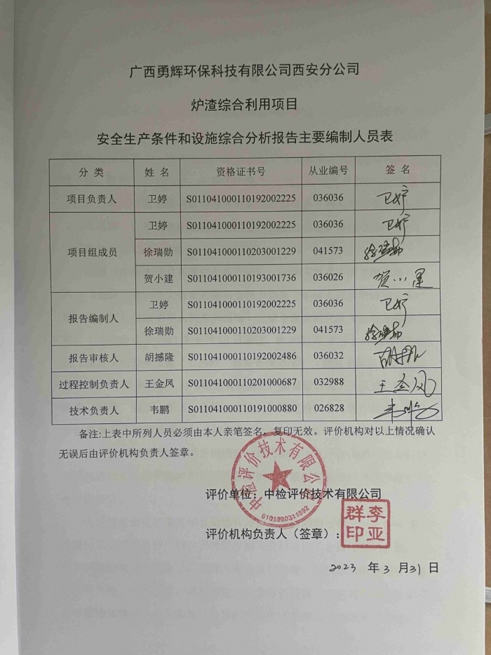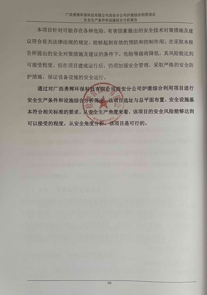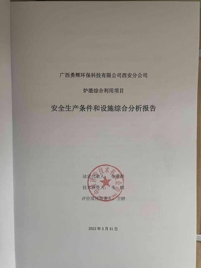 项目名称 | 广西勇辉环保科技有限公司西安分公司炉渣综合利用项目 安全生产条件和设施综合分析报告 | ||||||