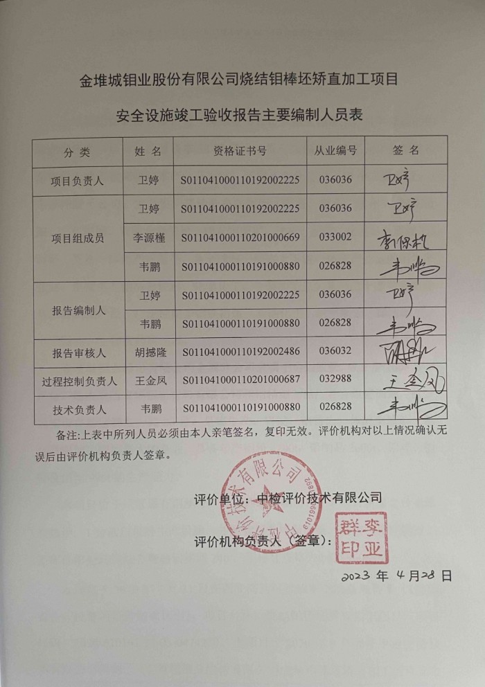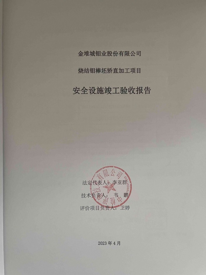 项目名称 | 金堆城钼业股份有限公司烧结钼棒坯矫直加工项目安全设施竣工验收报告 | ||||||