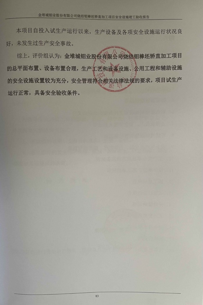 金堆城钼业股份有限公司烧结钼棒坯矫直加工项目安全设施竣工验收报告
