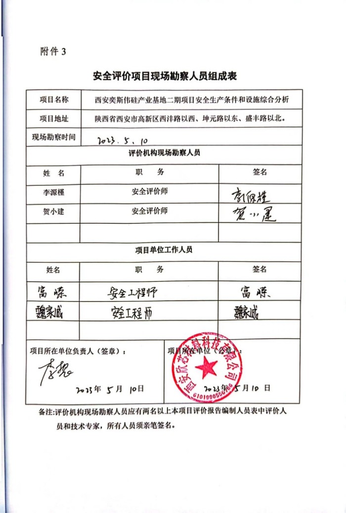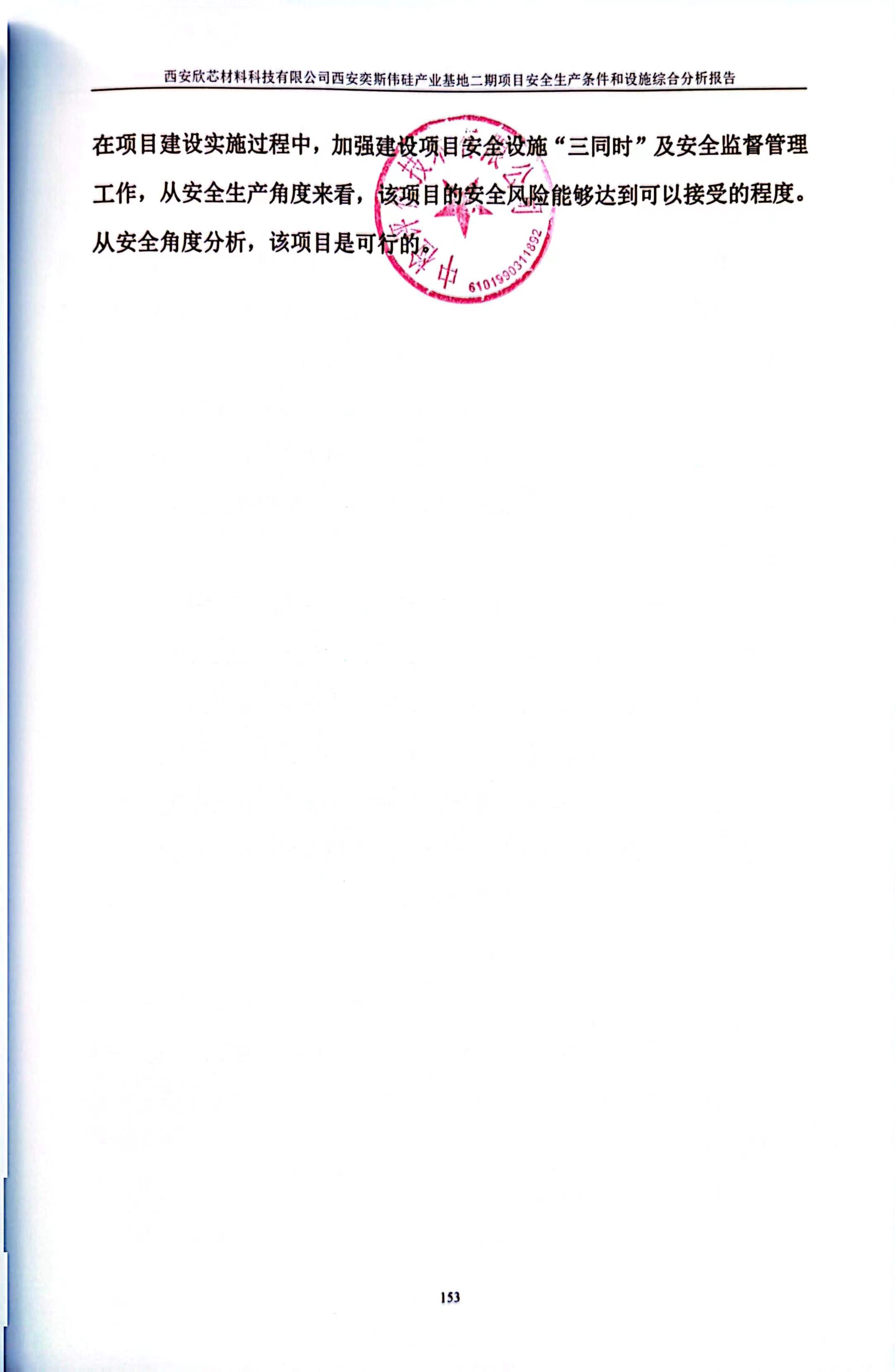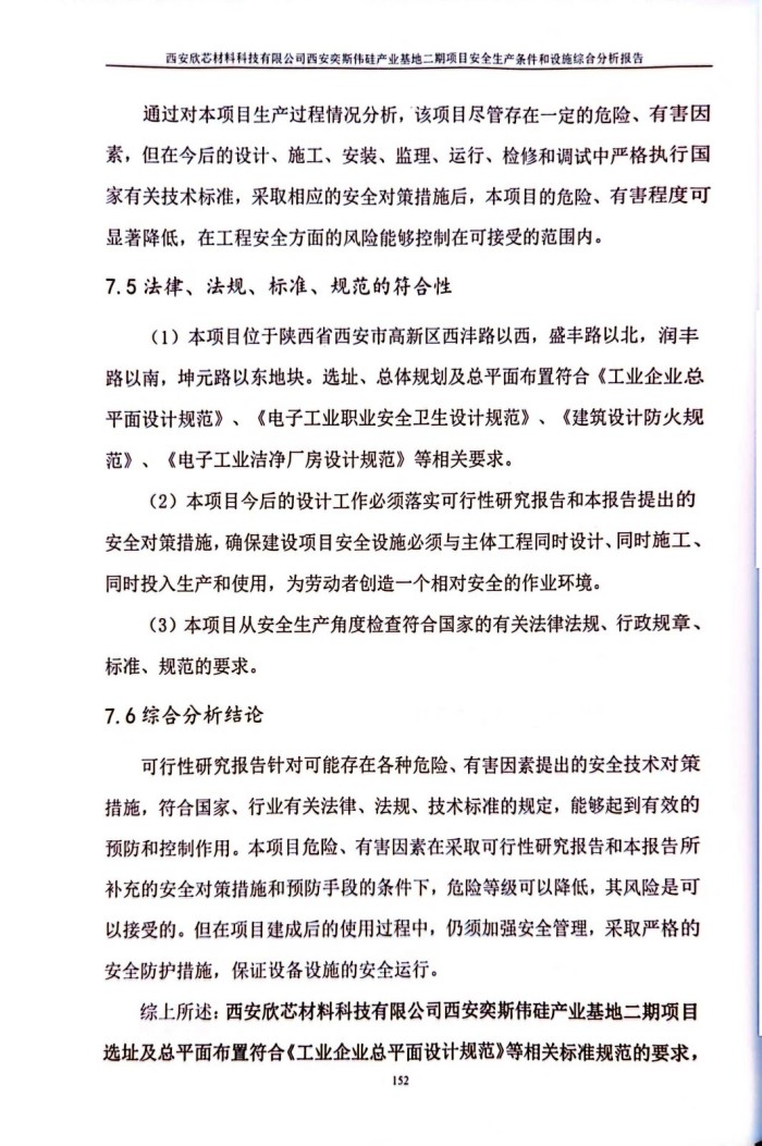 报告结论 | 西安欣芯材料科技有限公司西安奕斯伟硅产业基地二期项目选址及总平面布置符合《工业企业总平面设计规范》等相关标准规范的要求,在项目建设实施过程中,加强建设项目安全设施“三同时”及安全监督管理工作,从安全生产角度来看,该项目的安全风险能够达到可以接受的程度。从安全角度分析,该项目是可行的。 | ||||||