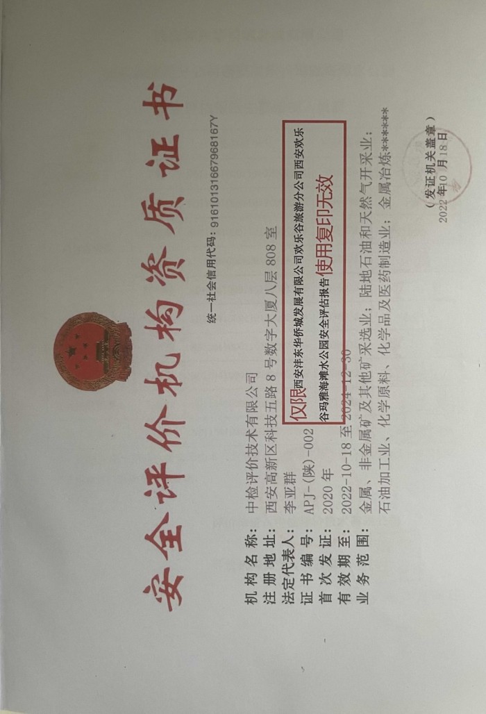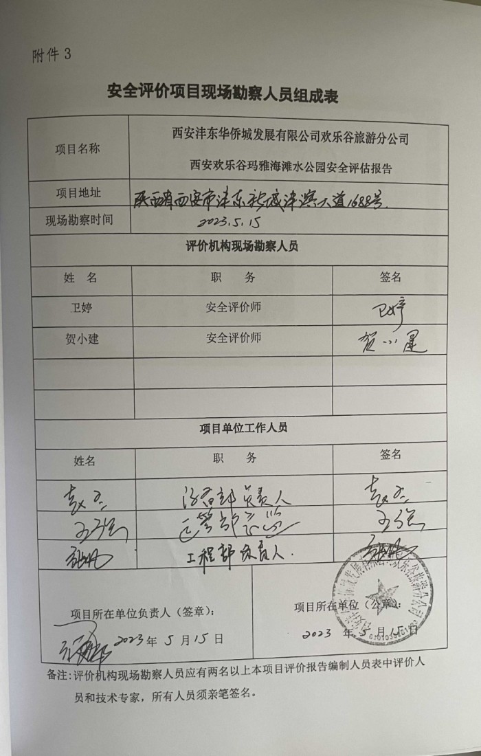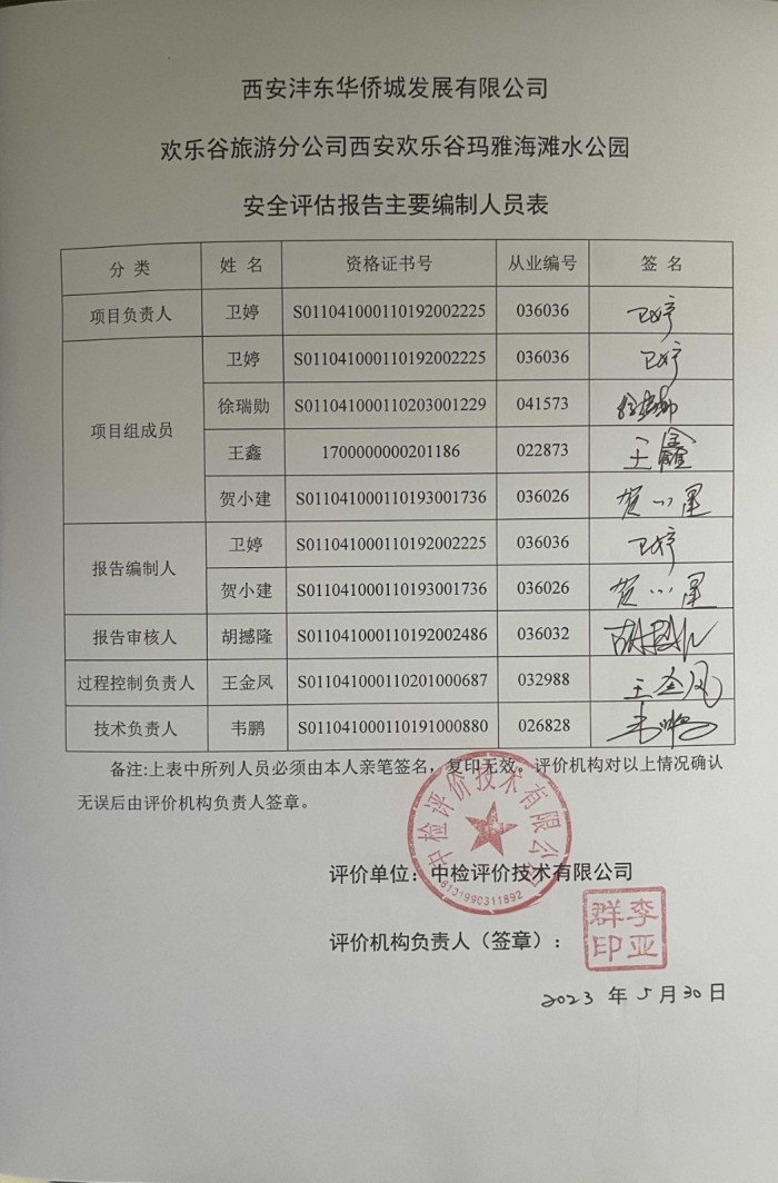 项目名称 | 西安沣东华侨城发展有限公司欢乐谷旅游分公司 西安欢乐谷玛雅海滩水公园安全评估报告 | ||||||