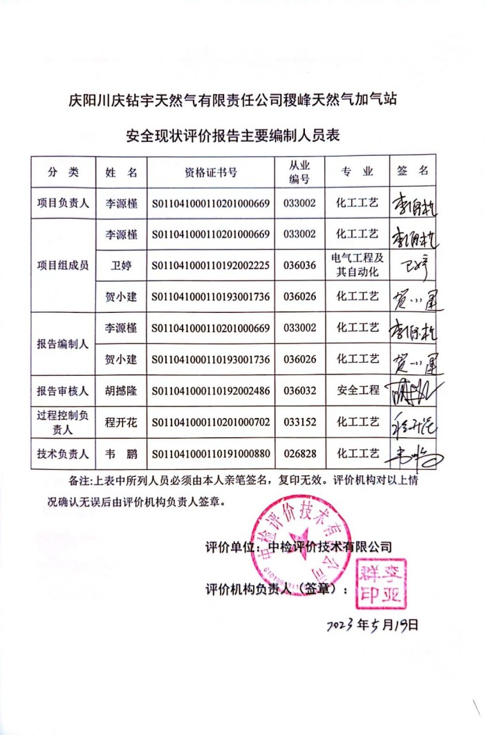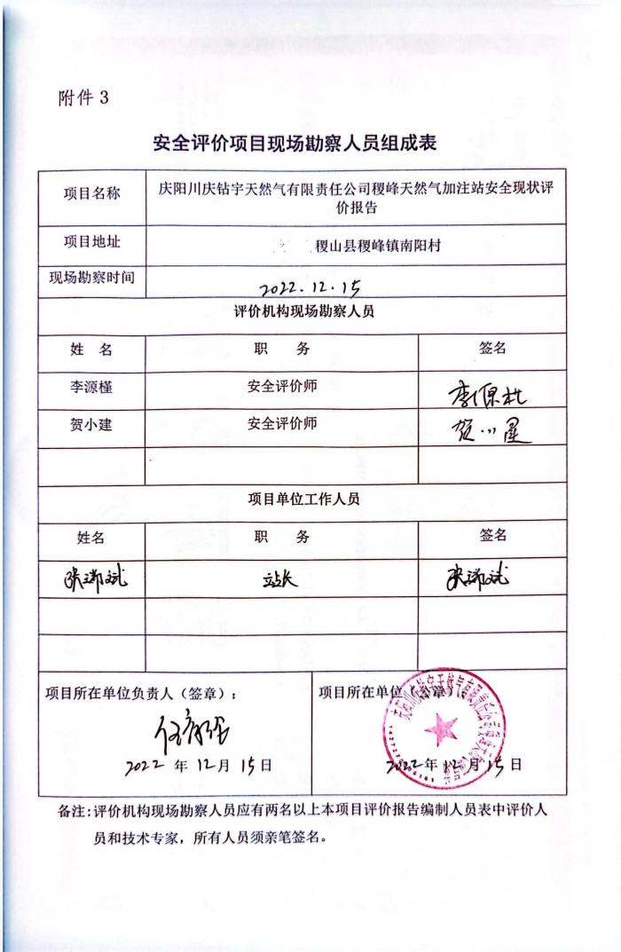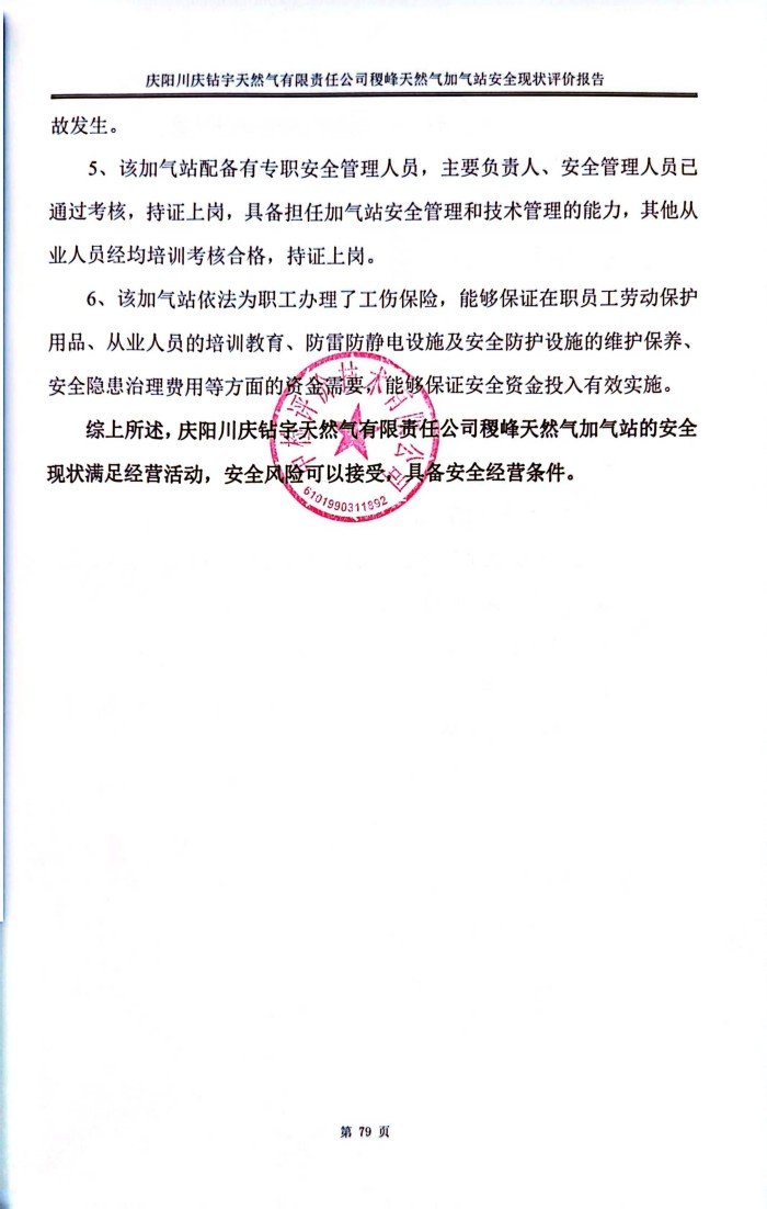 报告结论 | 庆阳川庆钻宇天然气有限责任公司稷峰天然气加气站的安全现状满足经营活动,安全风险可以接受,具备安全经营条件。 | ||||||