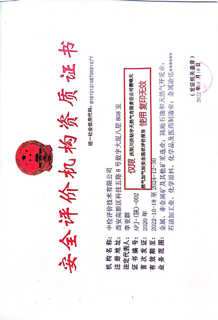 项目名称 | 庆阳川庆钻宇天然气有限责任公司稷峰天然气加气站安全现状评价报告 | ||||||
