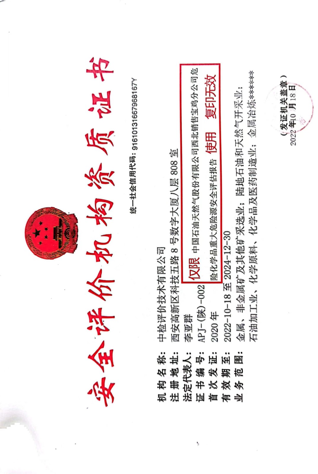 机构名称 | 中检评价技术有限公司 | 资质证号 | APJ-(陕)-002 | |||