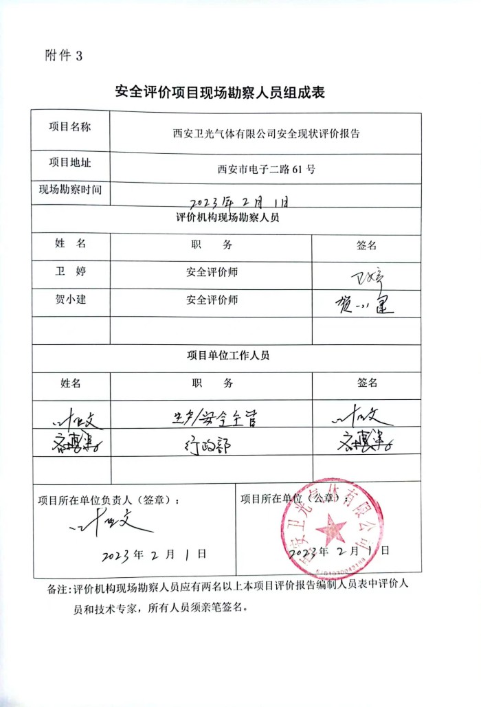 报告结论 | 西安卫光气体有限公司危险化学品生产、储存设施的安全状况及管理状况符合国家现行有关安全生产法律、法规和部门规章及标准,企业安全生产的风险可以接受,具备安全生产条件。 | ||||||