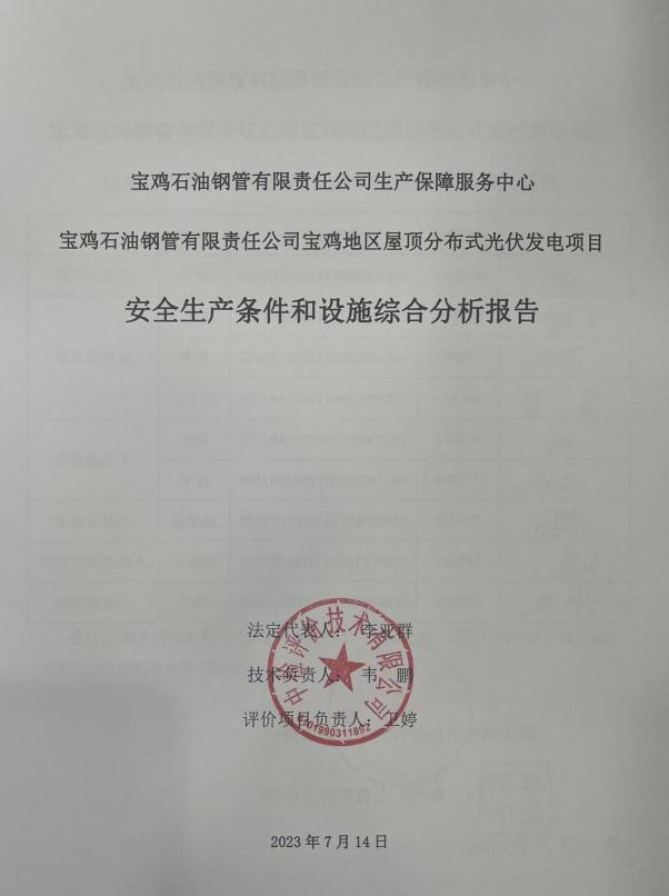 宝鸡石油钢管有限责任公司生产保障服务中心宝鸡石油钢管有限责任公司宝鸡地区屋顶分布式光伏发电项目安全生产条件和设施综合分析报告
