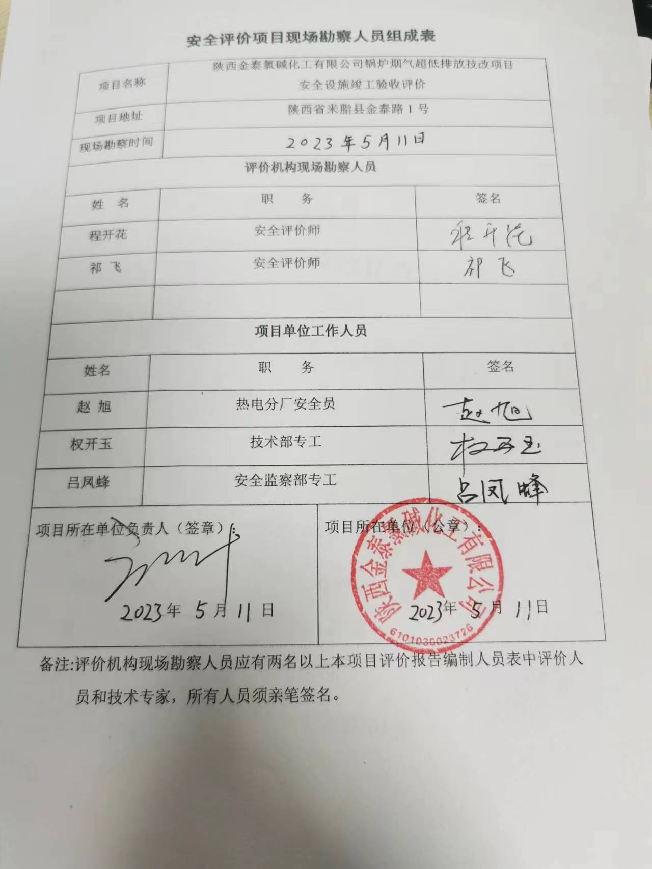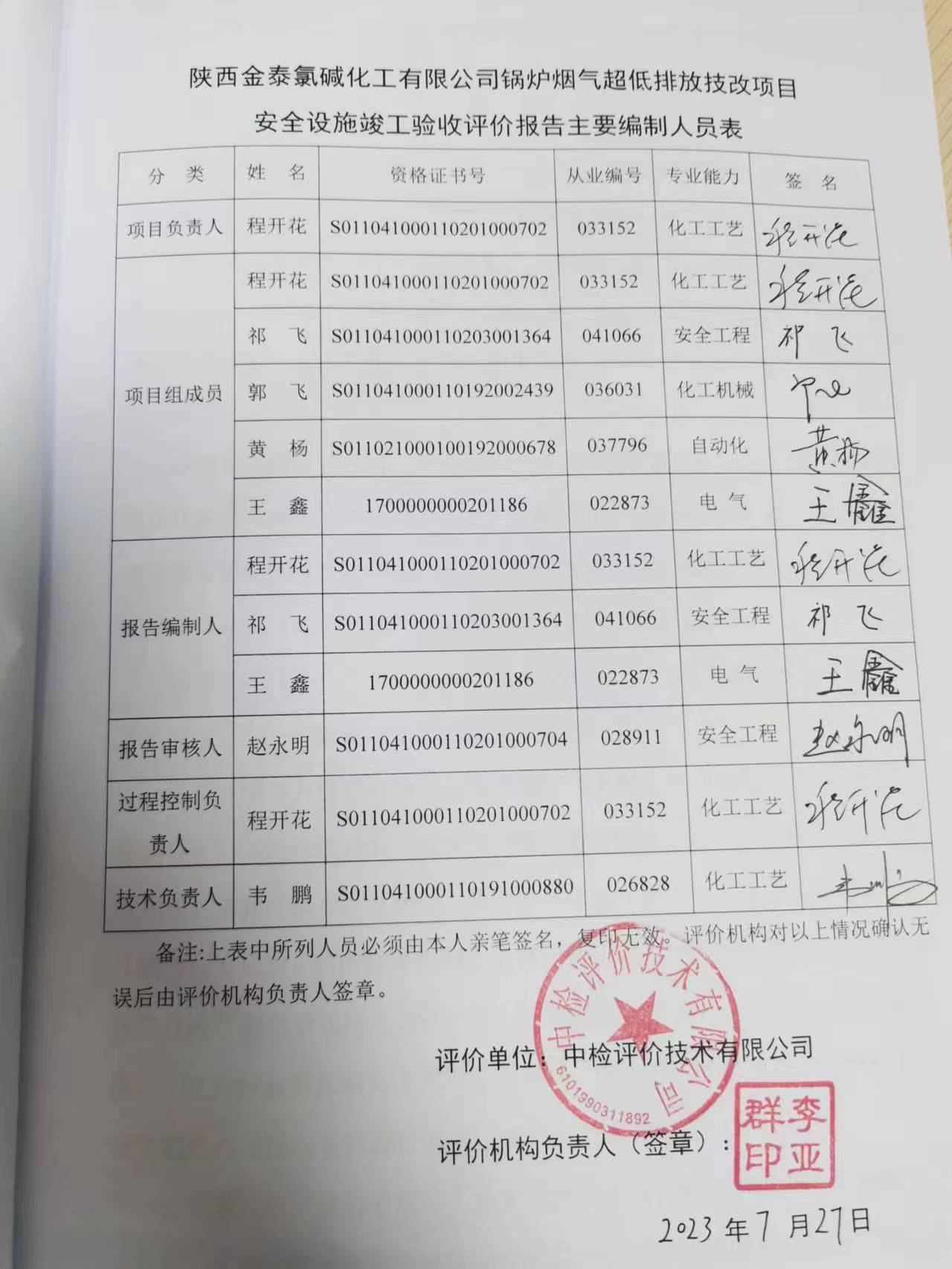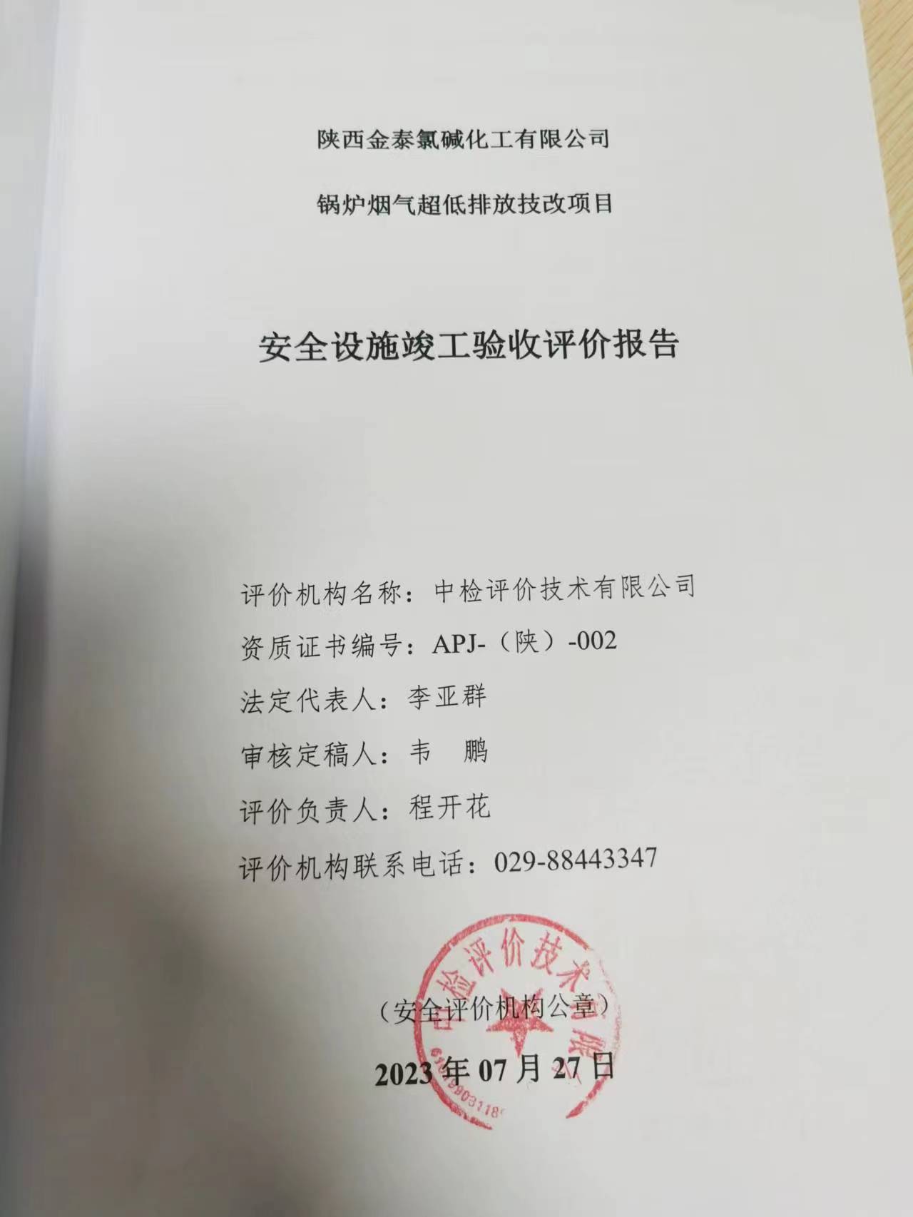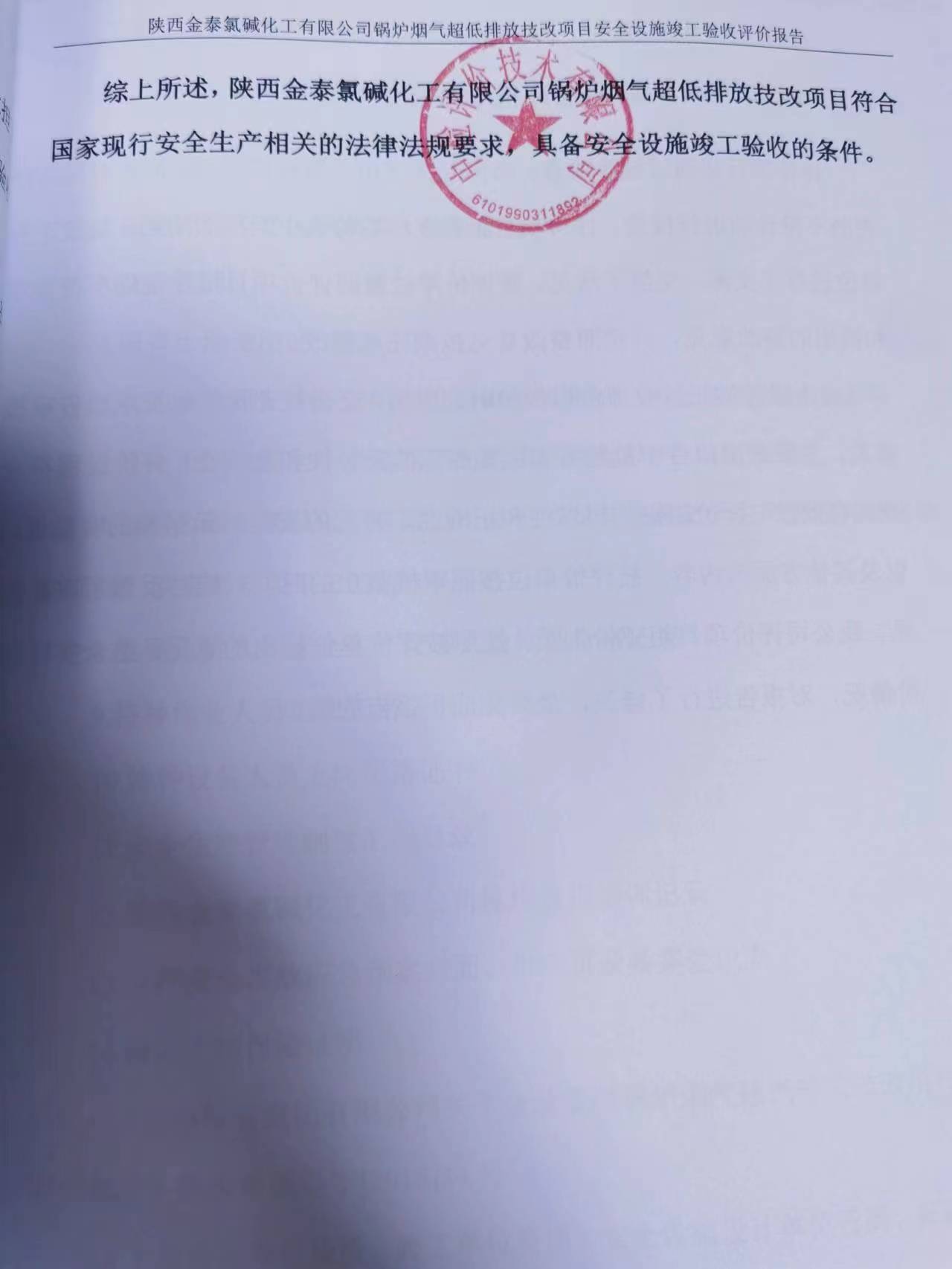 报告结论 | 陕西金泰氯碱化工有限公司锅炉烟气超低排放技改项目符合国家现行安全生产相关的法律法规要求,具备安全设施竣工验收的条件。 | ||||||