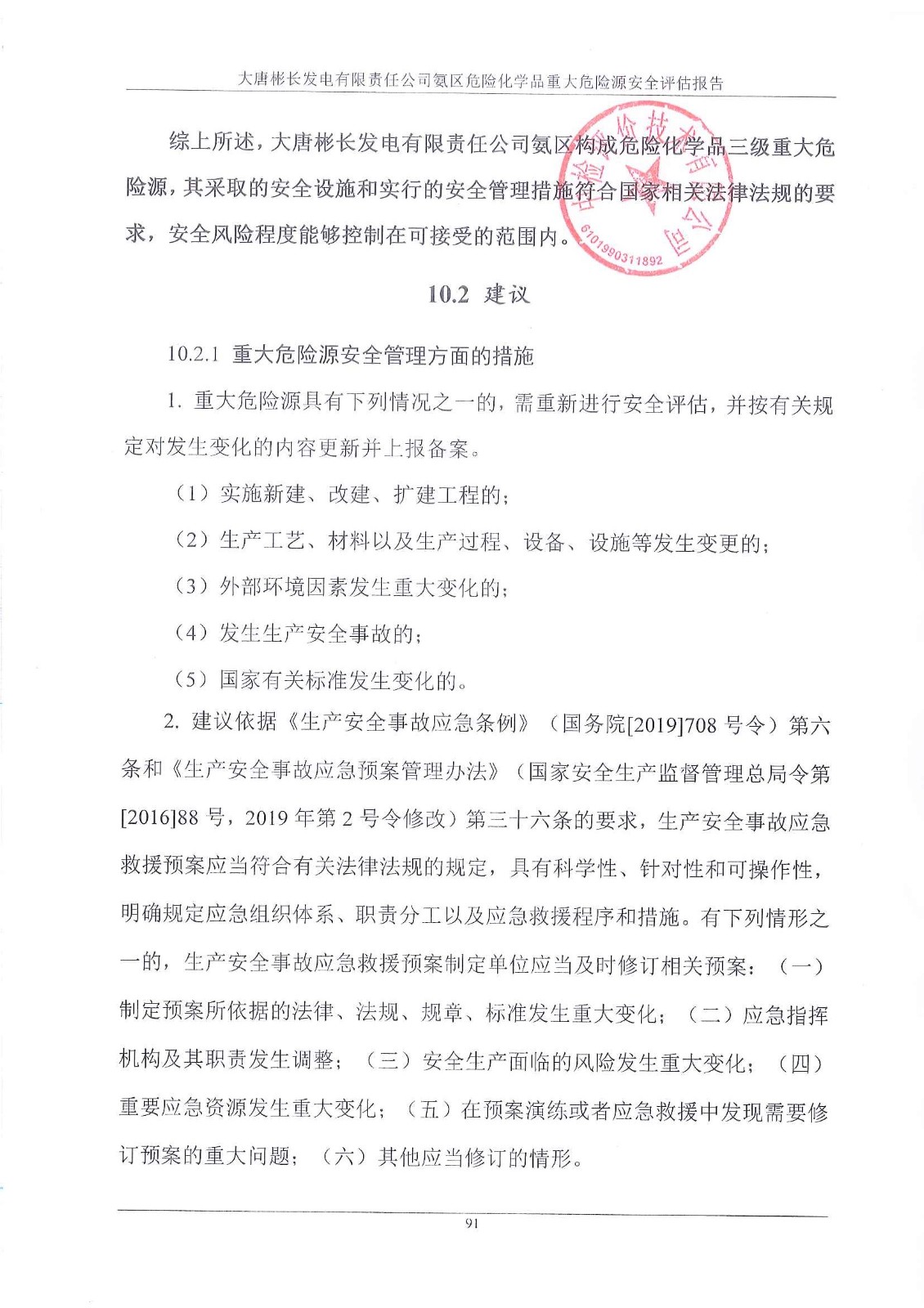 报告结论 | 大唐彬长发电有限责任公司氨区构成危险化学品三级重大危险源,其采取的安全设施和实行的安全管理措施符合国家相关法律法规的要求,安全风险程度能够控制在可接受的范围内。 | ||||||