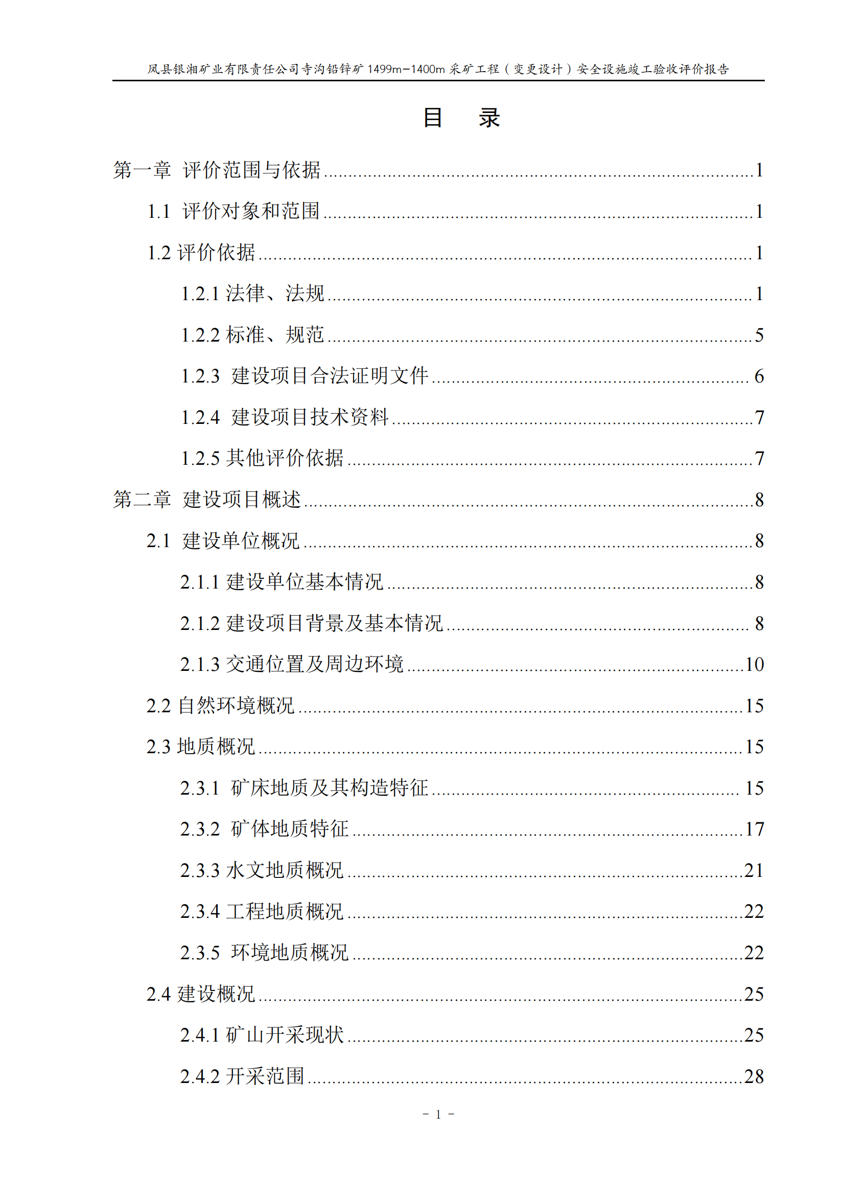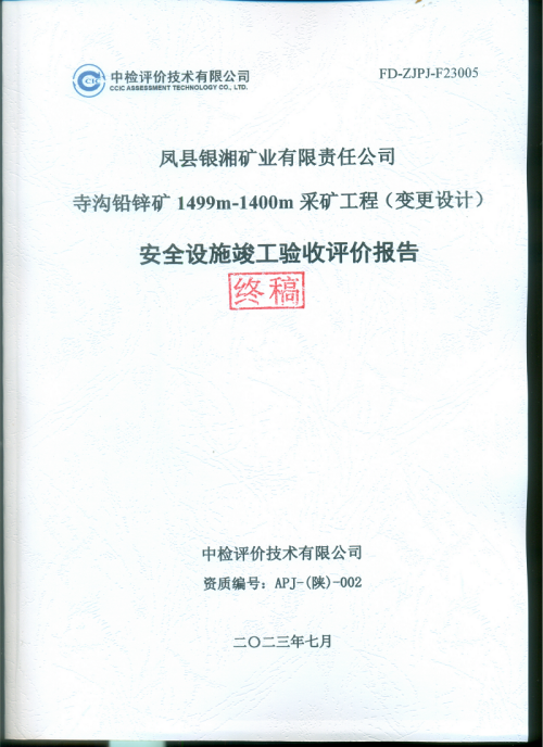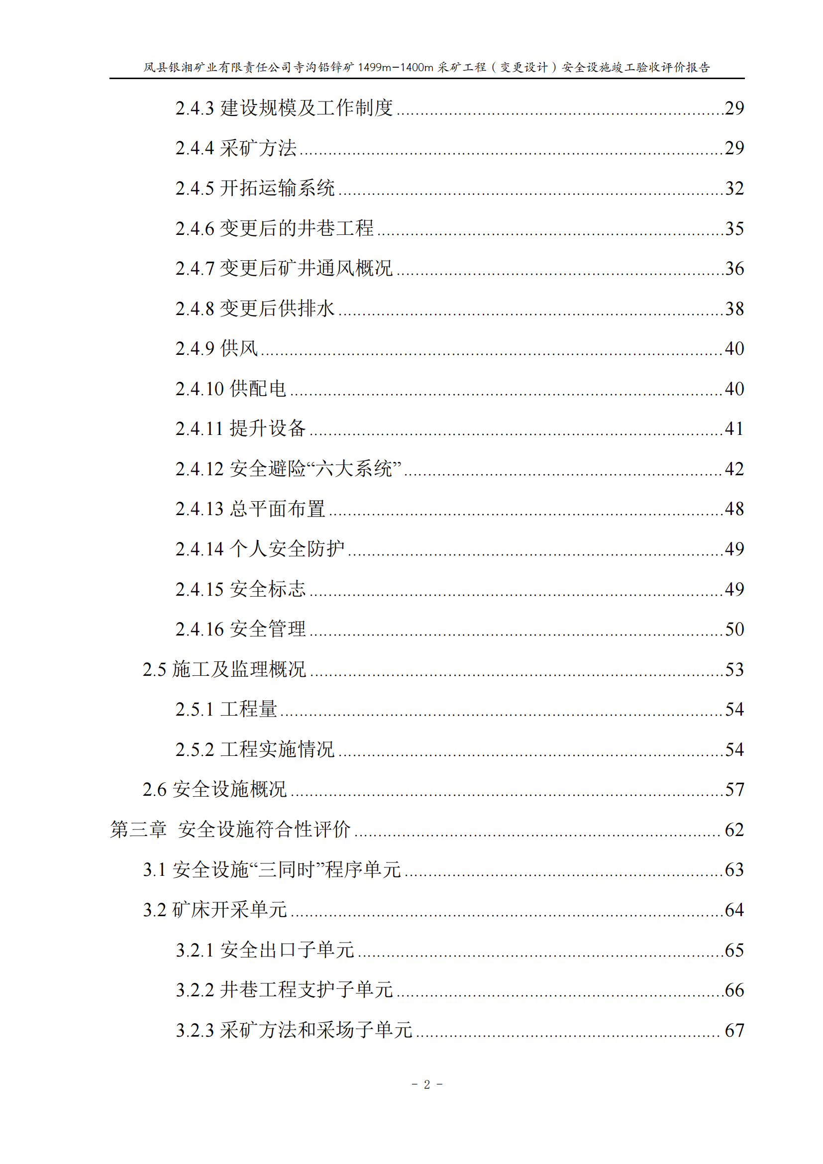 项目名称 | 凤县银湘矿业有限责任公司寺沟铅锌矿1499m-1400m采矿工程(变更设计) 安全设施竣工验收评价报告 | ||||||