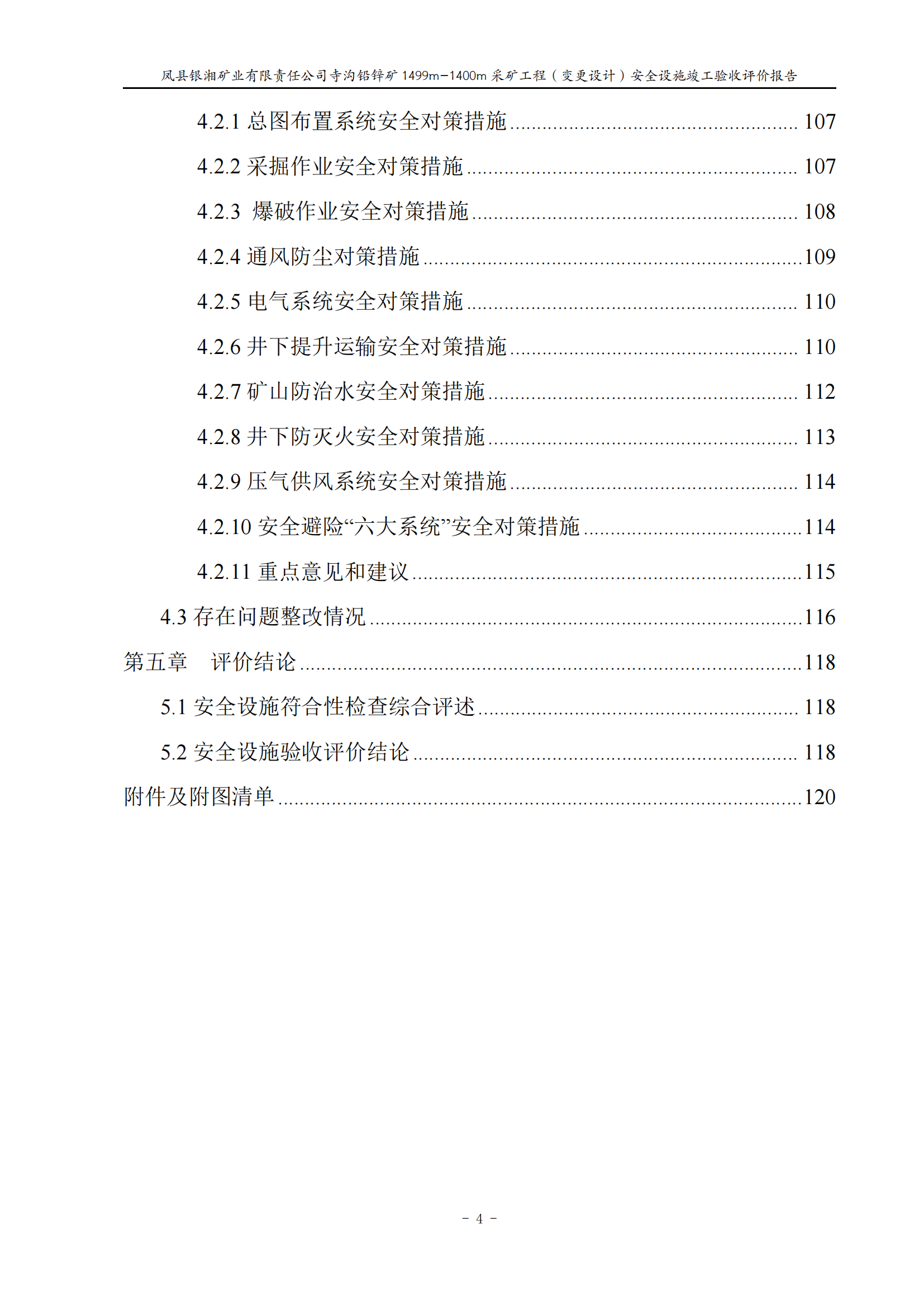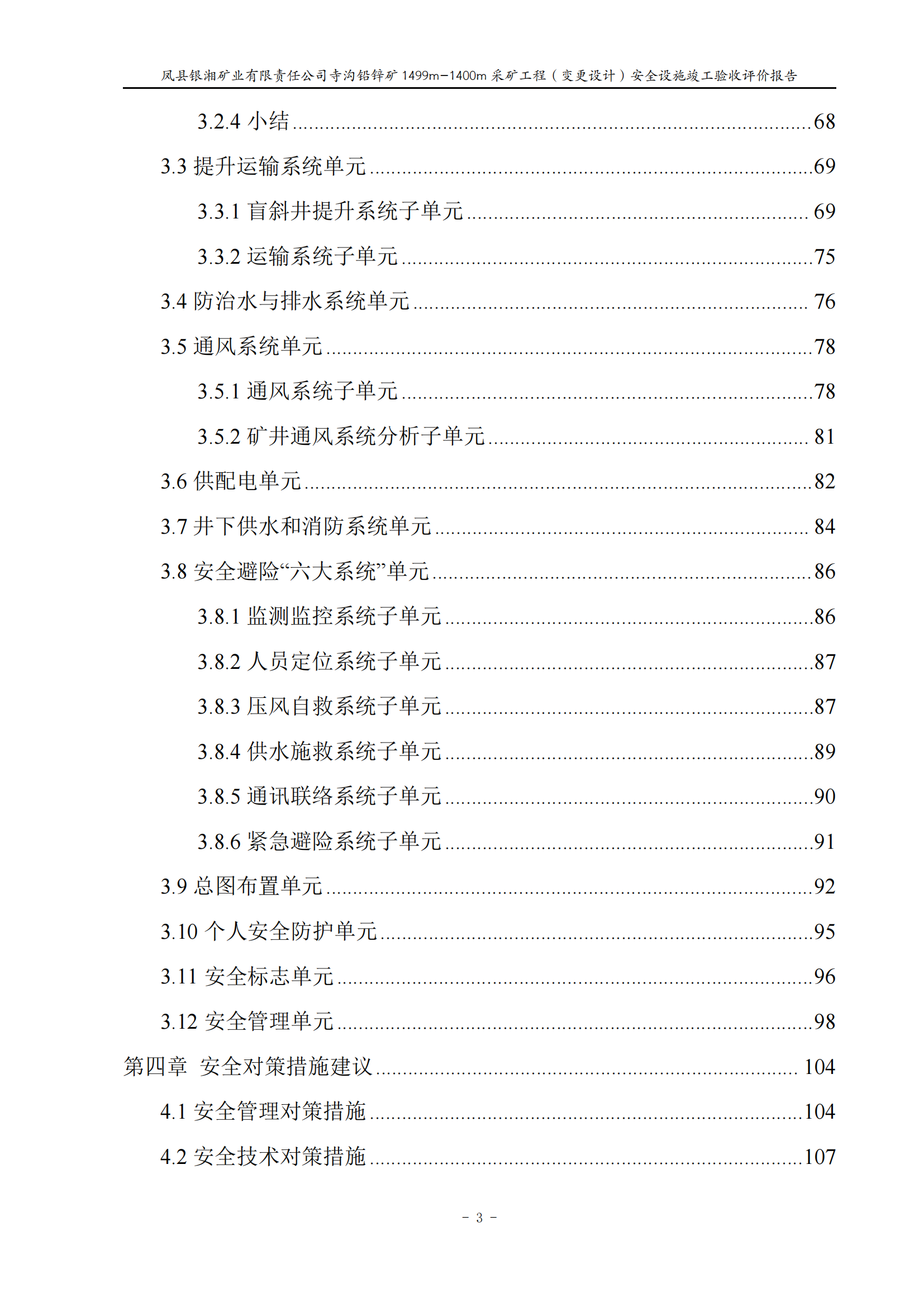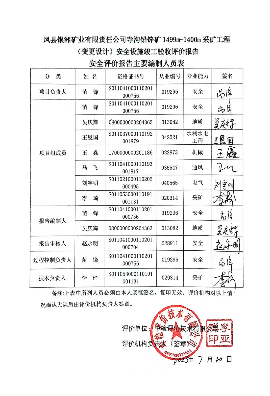 项目名称 | 凤县银湘矿业有限责任公司寺沟铅锌矿1499m-1400m采矿工程(变更设计) 安全设施竣工验收评价报告 | ||||||