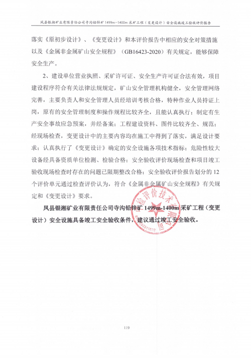 报告结论 | 凤县银湘矿业有限责任公司寺沟铅锌矿1499m-1400m采矿工程(变更设计)安全设施具备竣工安全验收条件,建议通过竣工安全验收。 | ||||||
