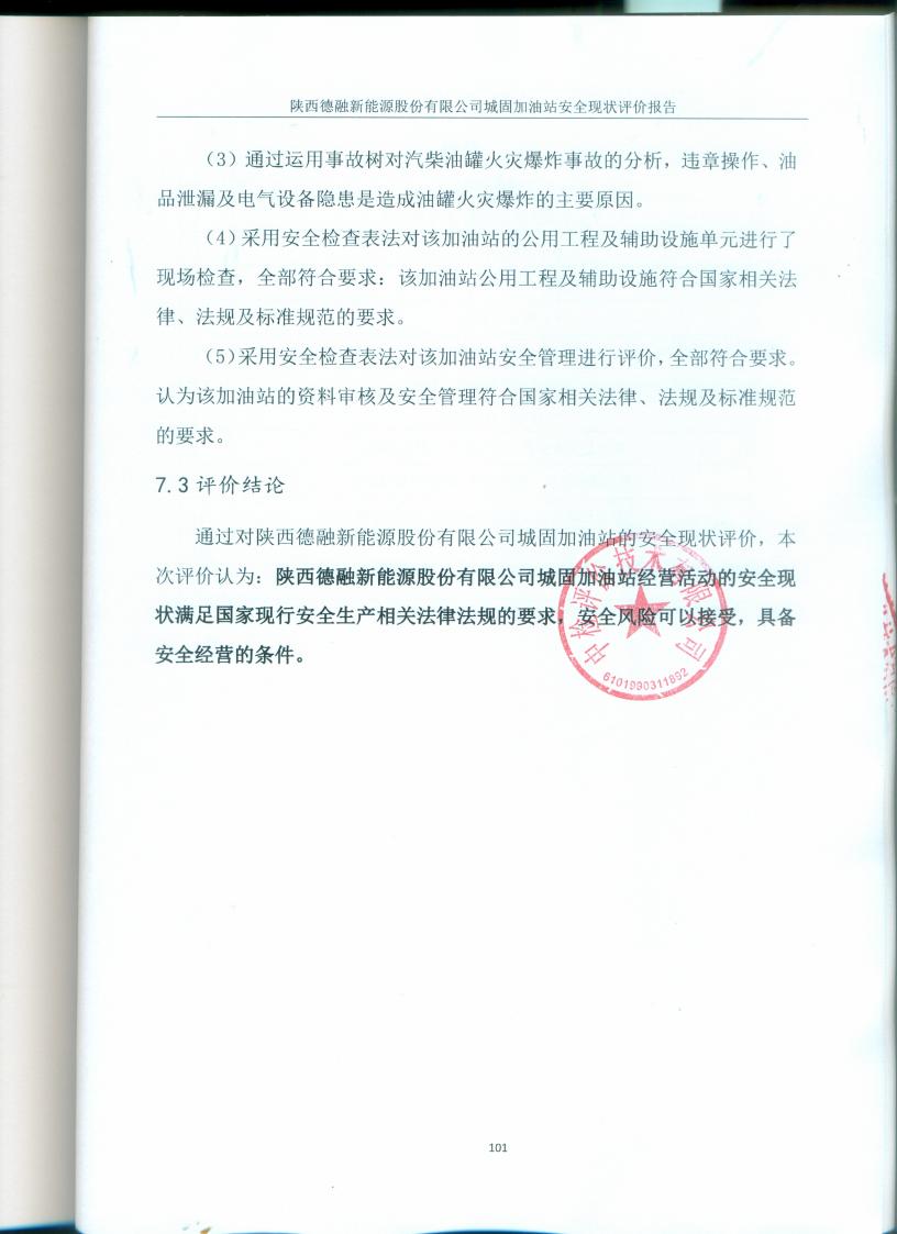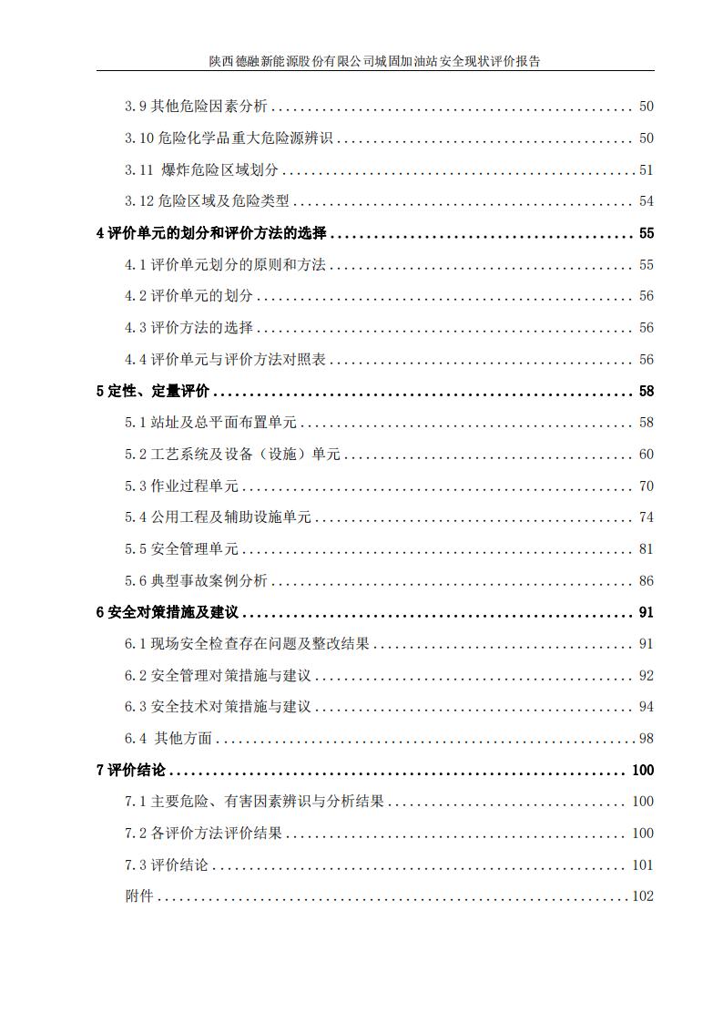 报告结论 | 通过对陕西德融新能源股份有限公司城固加油站的安全现状评价,本次评价认为:陕西德融新能源股份有限公司城固加油站经营活动的安全现状满足国家现行安全生产相关法律法规的要求,安全风险可以接受,具备安全经营的条件。 | ||||||