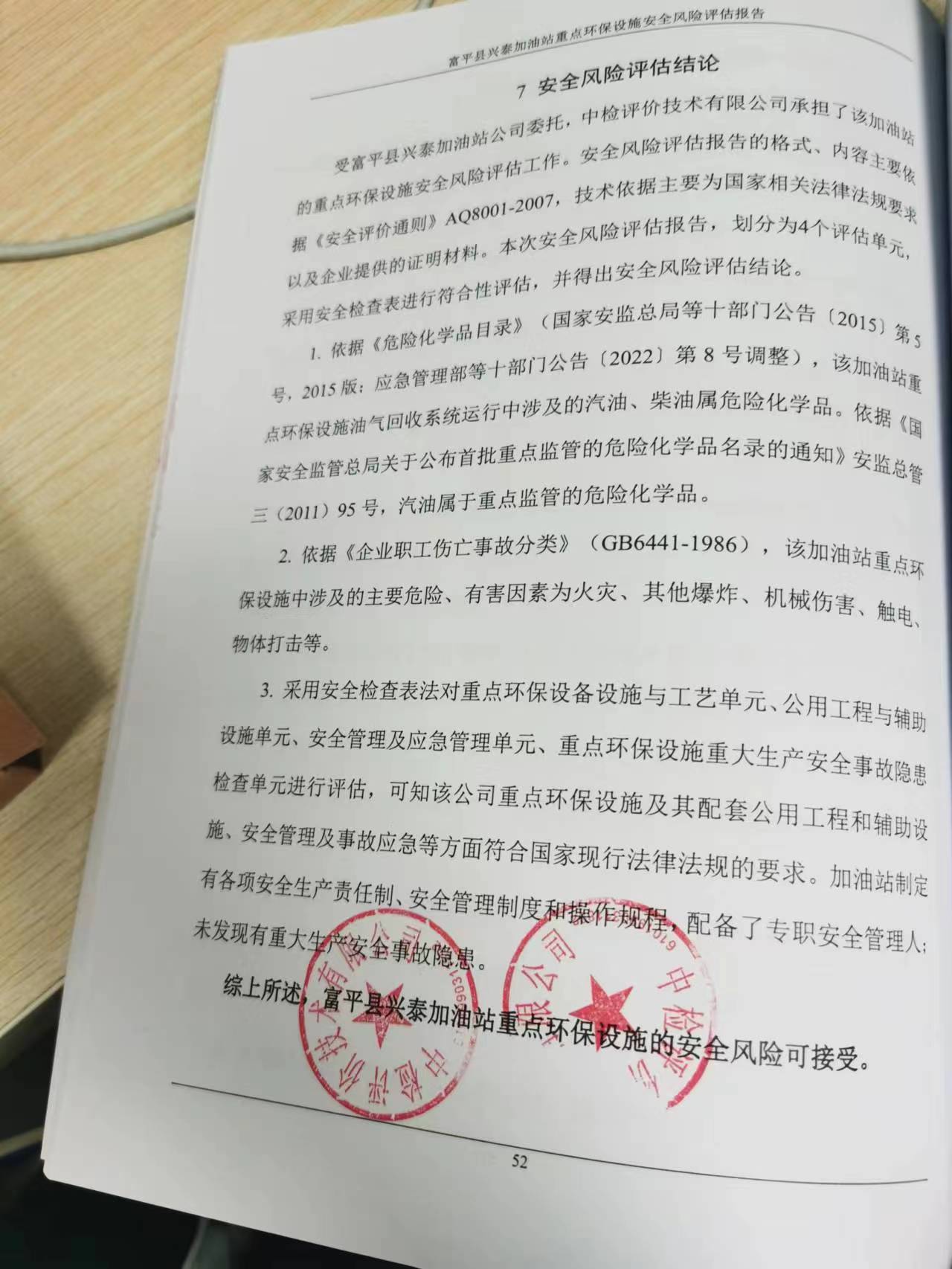 报告结论 | 受富平县兴泰加油站公司委托,中检评价技术有限公司承担了该加油站的重点环保设施安全风险评估工作。安全风险评估报告的格式、内容主要依据《安全评价通则》AQ8001-2007,技术依据主要为国家相关法律法规要求以及企业提供的证明材料。本次安全风险评估报告,划分为4个评估单元,采用安全检查表进行符合性评估,并得出安全风险评估结论。 依据《危险化学品目录》(国家安监总局等十部门公告〔2015〕第5号,2015版;应急管理部等十部门公告〔2022〕第8号调整),该加油站重点环保设施油气回收系统运行中涉及的汽油、柴油属危险化学品。依据《国家安全监管总局关于公布首批重点监管的危险化学品名录的通知》安监总管三(2011)95号,汽油属于重点监管的危险化学品。 2. 依据《企业职工伤亡事故分类》(GB6441-1986),该加油站重点环保设施中涉及的主要危险、有害因素为火灾、其他爆炸、机械伤害、触电、物体打击等。 3. 采用安全检查表法对重点环保设备设施与工艺单元、公用工程与辅助设施单元、安全管理及应急管理单元、重点环保设施重大生产安全事故隐患检查单元进行评估,可知该公司重点环保设施及其配套公用工程和辅助设施、安全管理及事故应急等方面符合国家现行法律法规的要求。加油站制定有各项安全生产责任制、安全管理制度和操作规程,配备了专职安全管理人;未发现有重大生产安全事故隐患。 综上所述,富平县兴泰加油站重点环保设施的安全风险可接受。 | ||||||
