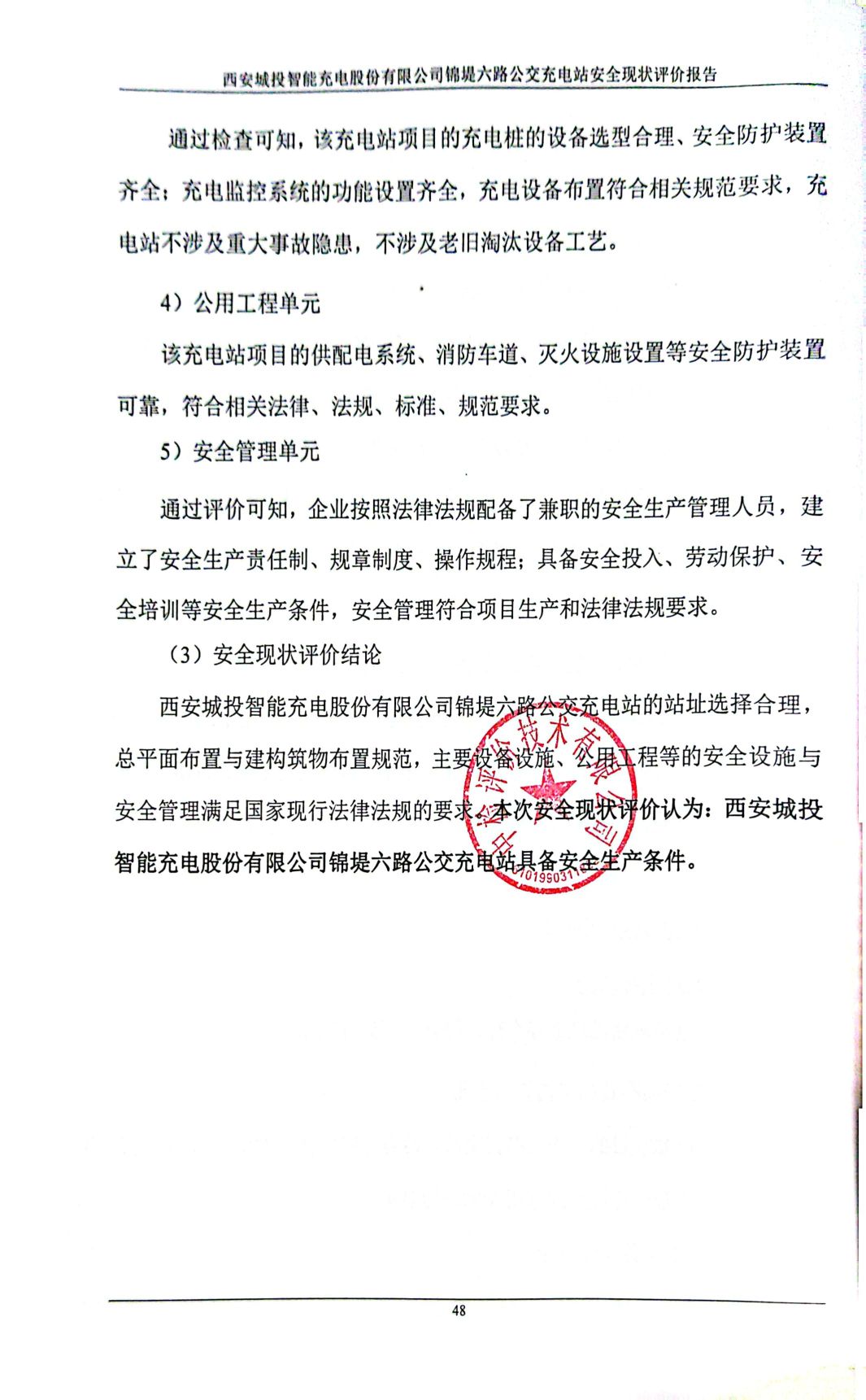 报告结论 | 西安城投智能充电股份有限公司锦堤六路公交充电站的站址选择合理,总平面布置与建构筑物布置规范,主要设备设施、公用工程等的安全设施与安全管理满足国家现行法律法规的要求。本次安全现状评价认为:西安城投智能充电股份有限公司锦堤六路公交充电站具备安全生产条件。 | ||||||