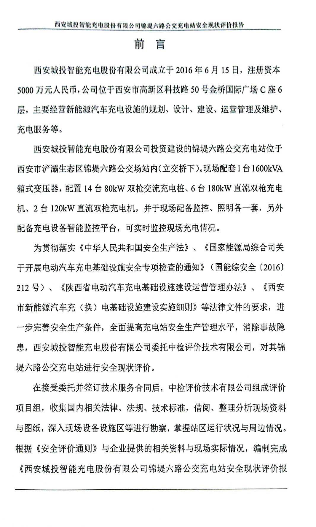 西安城投智能充电股份有限公司锦堤六路公交充电站安全现状评价