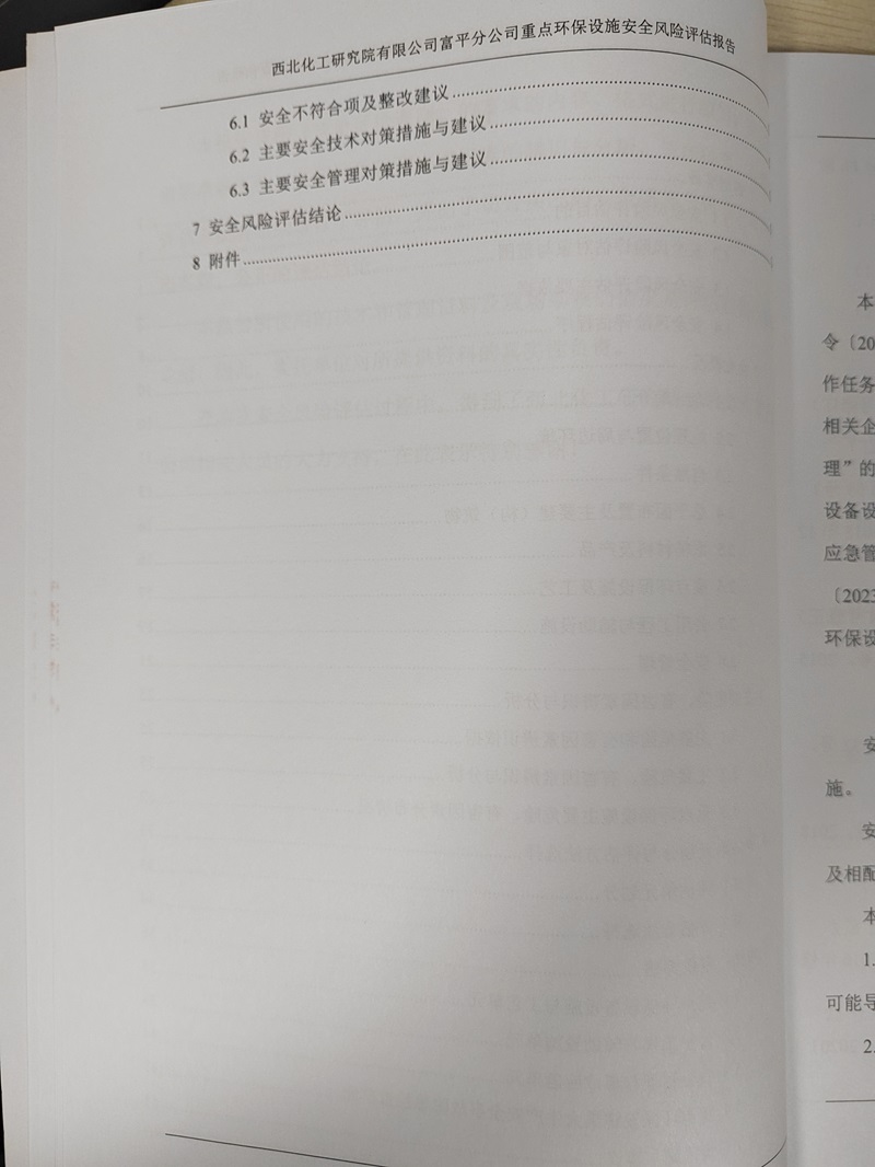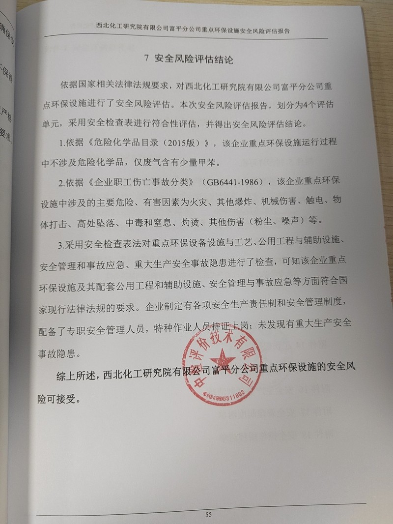 报告结论 | 西北化工研究院有限公司富平分公司重点环保设施的安全风险可接受。 | ||||||