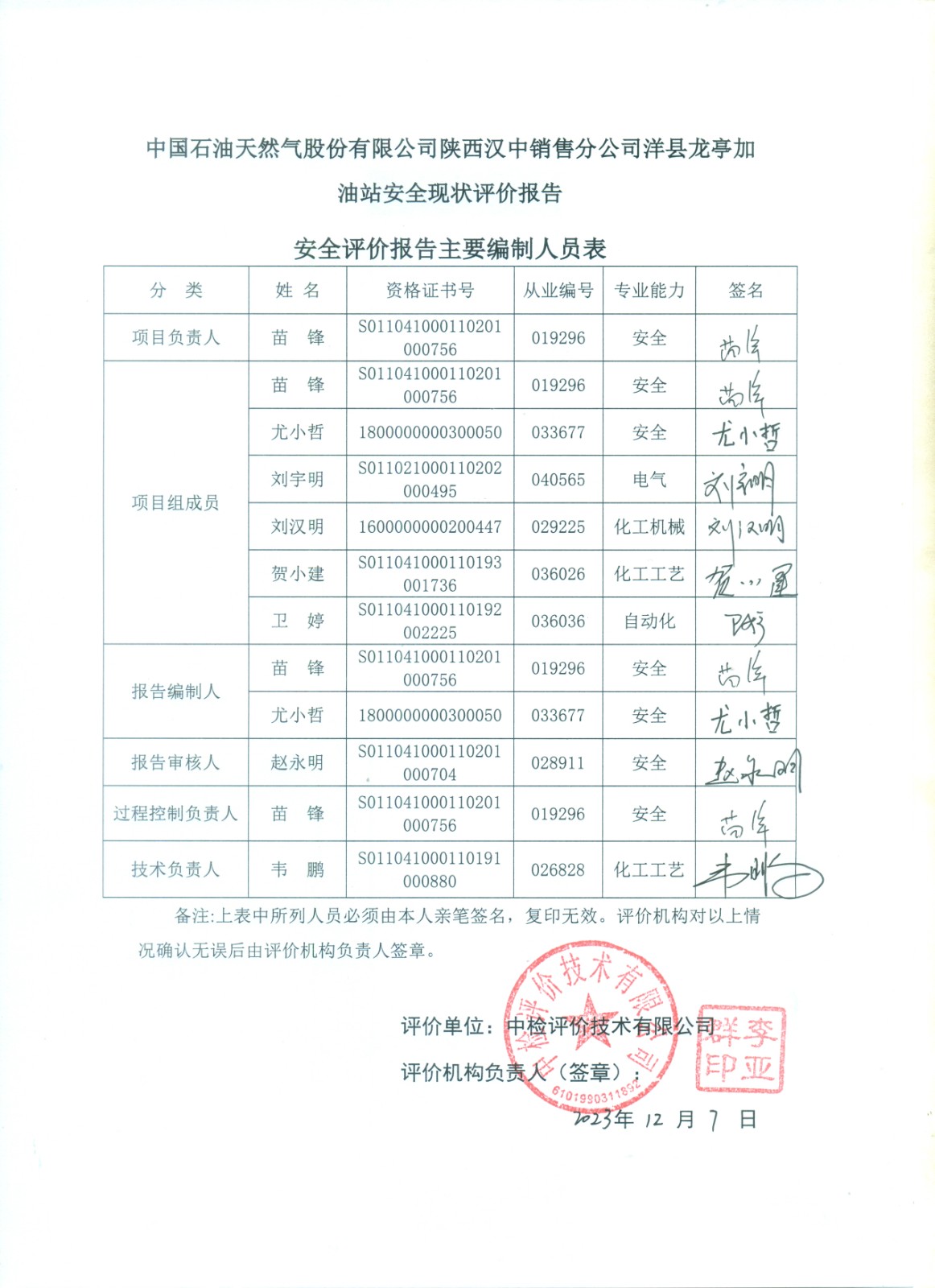 安全评价项目管理 | 项目组长 | 技术负责人 | 过程控制负责人 | ||||
