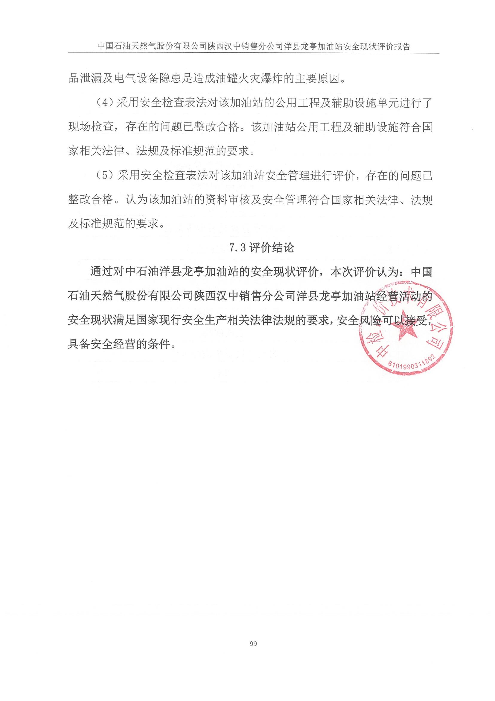 报告结论 | 本次安全现状评价的结论为:中国石油天然气股份有限公司陕西汉中销售分公司洋县龙亭加油站的安全现状满足经营活动,安全风险可以接受,具备安全经营条件。 | ||||||