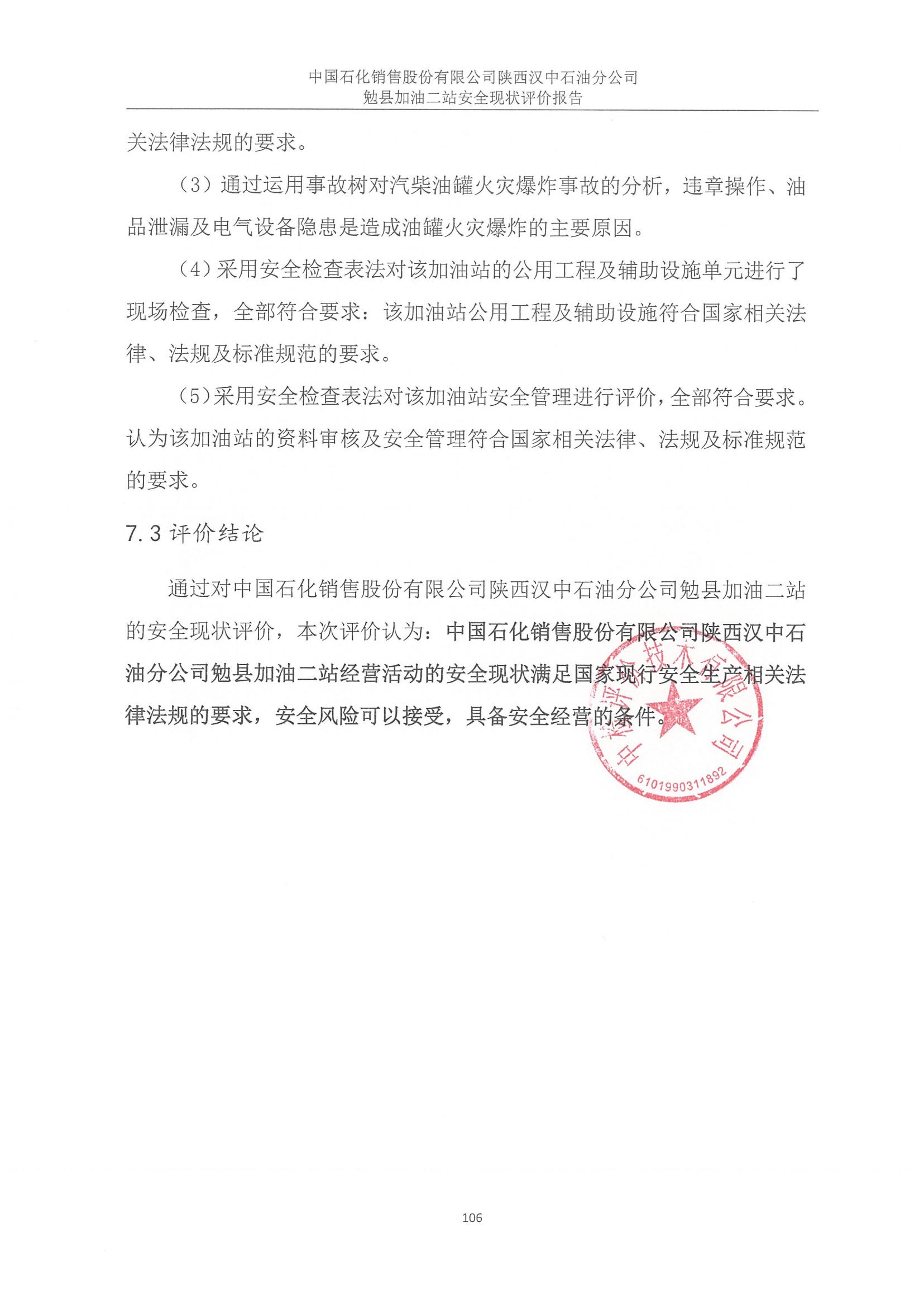 报告结论 | 评价结论:通过对中国石化销售股份有限公司陕西汉中石油分公司 勉县加油二站的安全现状评价,本次评价认为:中国石化销售股份有限公司陕西汉中石油分公司勉县加油二站经营活动的安全现状满足国家现行安全生产相关法律法规的要求,安全风险可以接受,具备安全经营的条件。 | ||||||