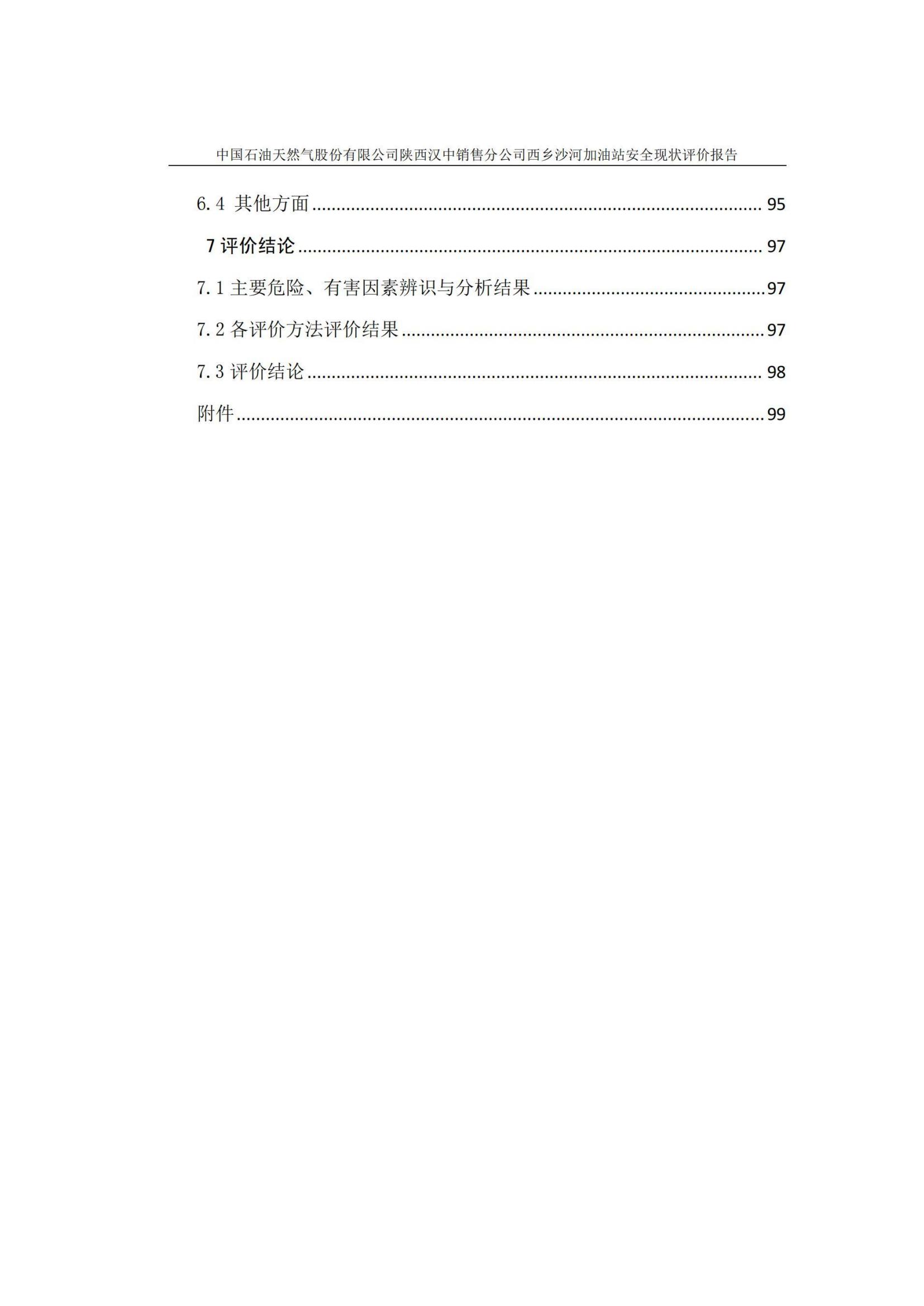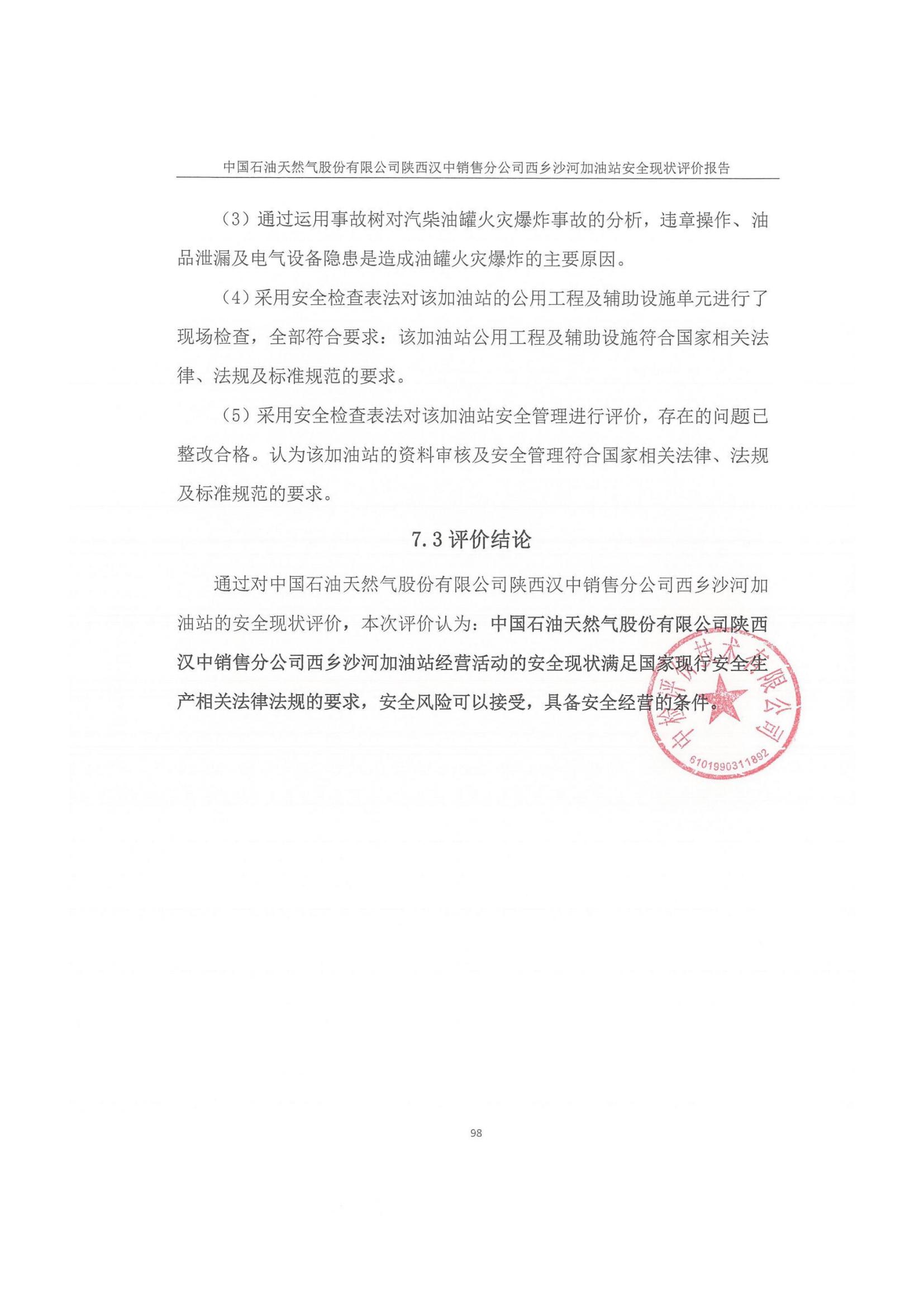 报告结论 | 本次安全现状评价的结论为:中国石油天然气股份有限公司陕西汉中销售分公司西乡沙河加油站的安全现状满足经营活动,安全风险可以接受,具备安全经营条件。 | ||||||