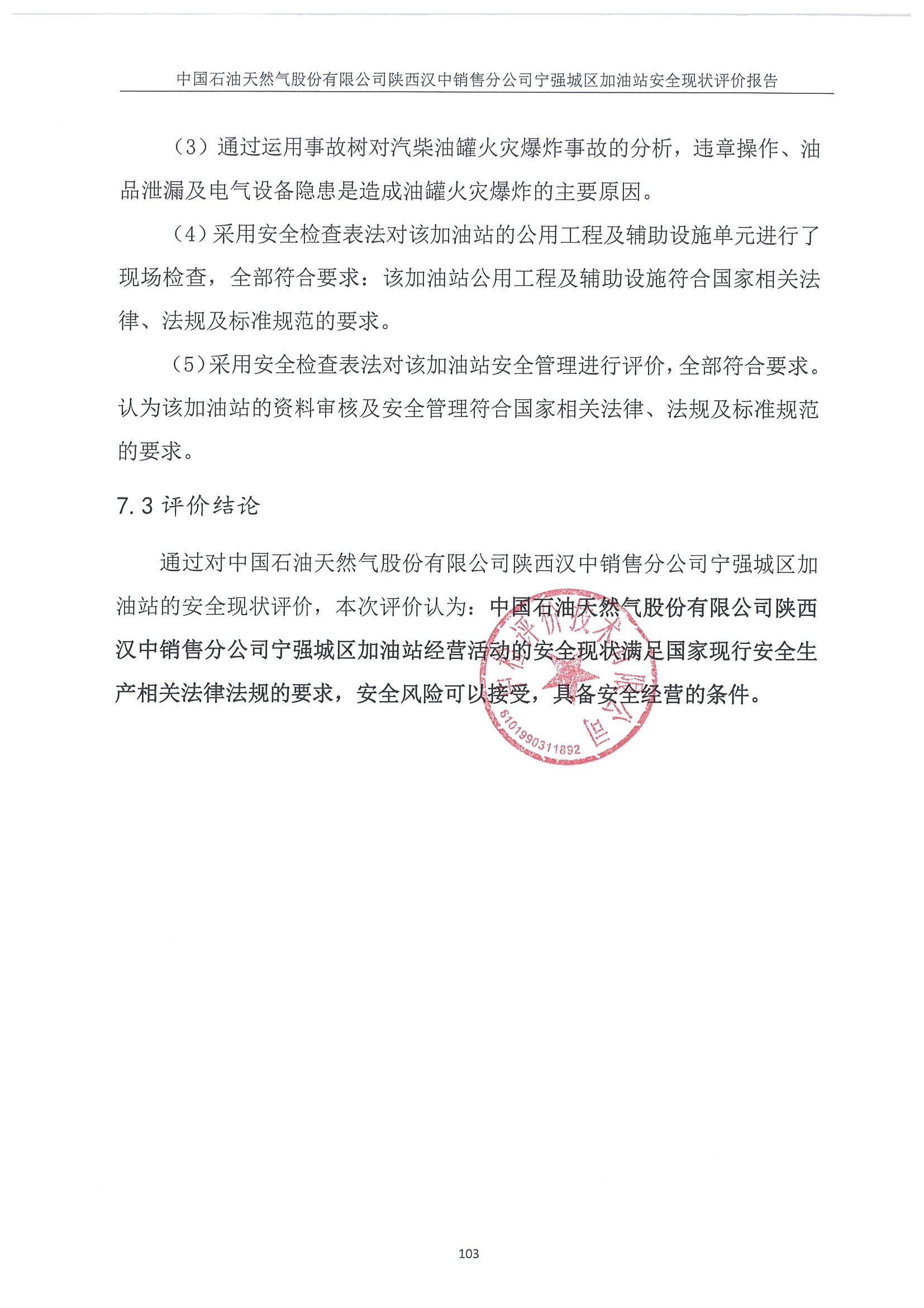 报告结论 | 评价结论:通过对中国石油天然气股份有限公司陕西汉中销售分公司宁强城区加油站的安全现状评价,本次评价认为:中国石油天然气股份有限公司陕西汉中销售分公司宁强城区加油站经营活动的安全现状满足国家现行安全生产相关法律法规的要求,安全风险可以接受,具备安全经营的条件。 | ||||||
