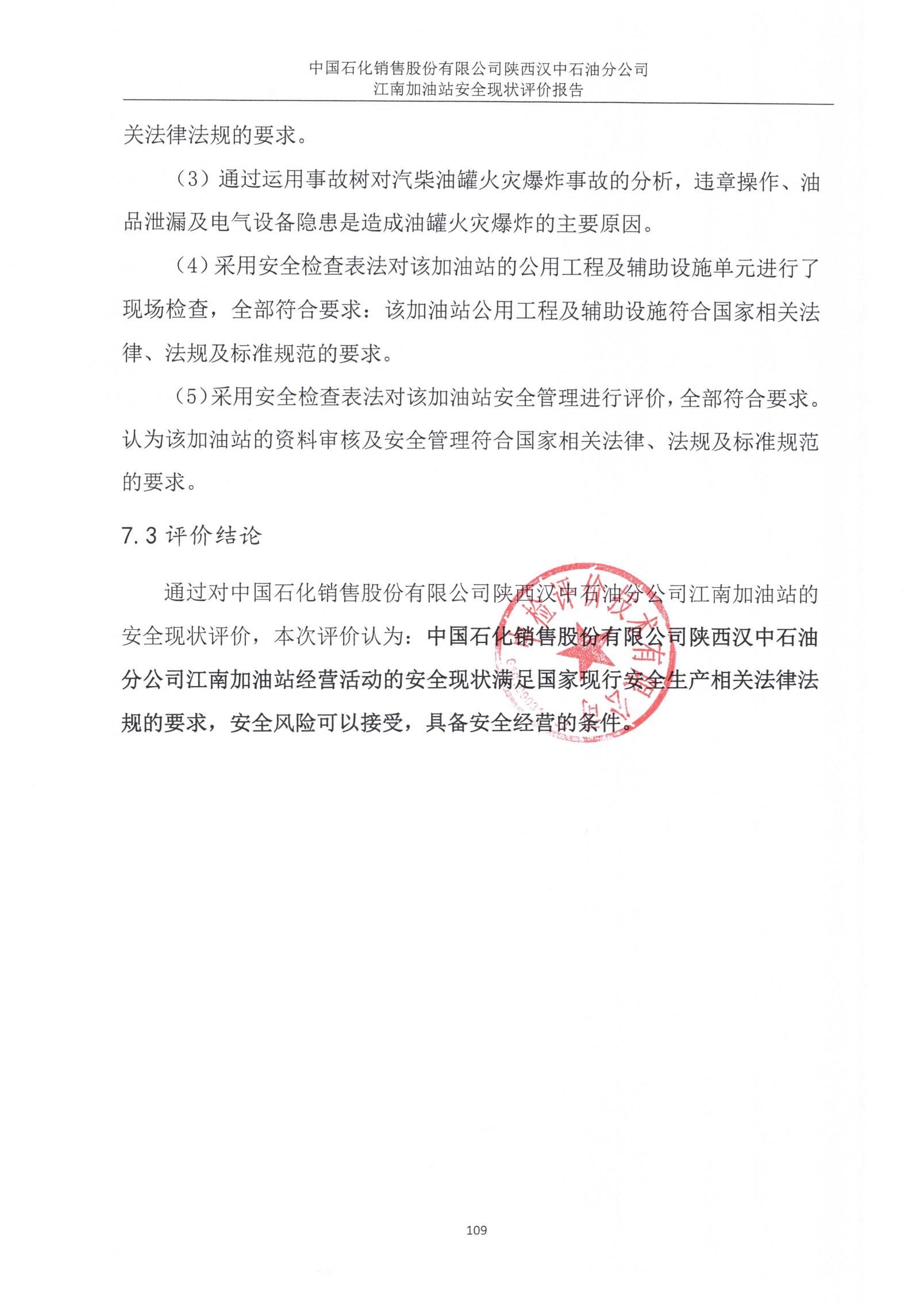 报告结论 | 评价结论:通过对中国石化销售股份有限公司陕西汉中石油分公司江南加油站的安全现状评价,本次评价认为:中国石化销售股份有限公司陕西汉中石油分公司江南加油站经营活动的安全现状满足国家现行安全生产相关法律法规的要求,安全风险可以接受,具备安全经营的条件。 | ||||||
