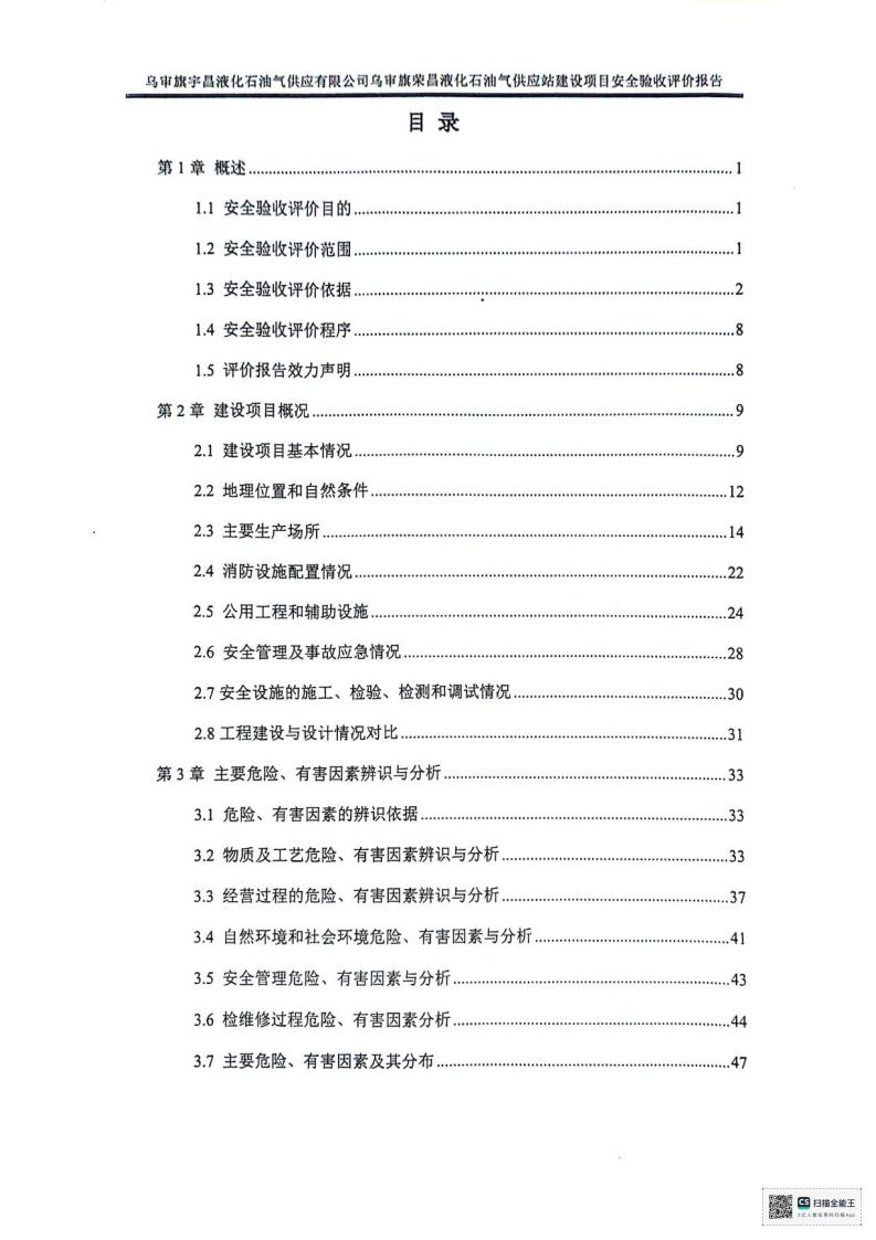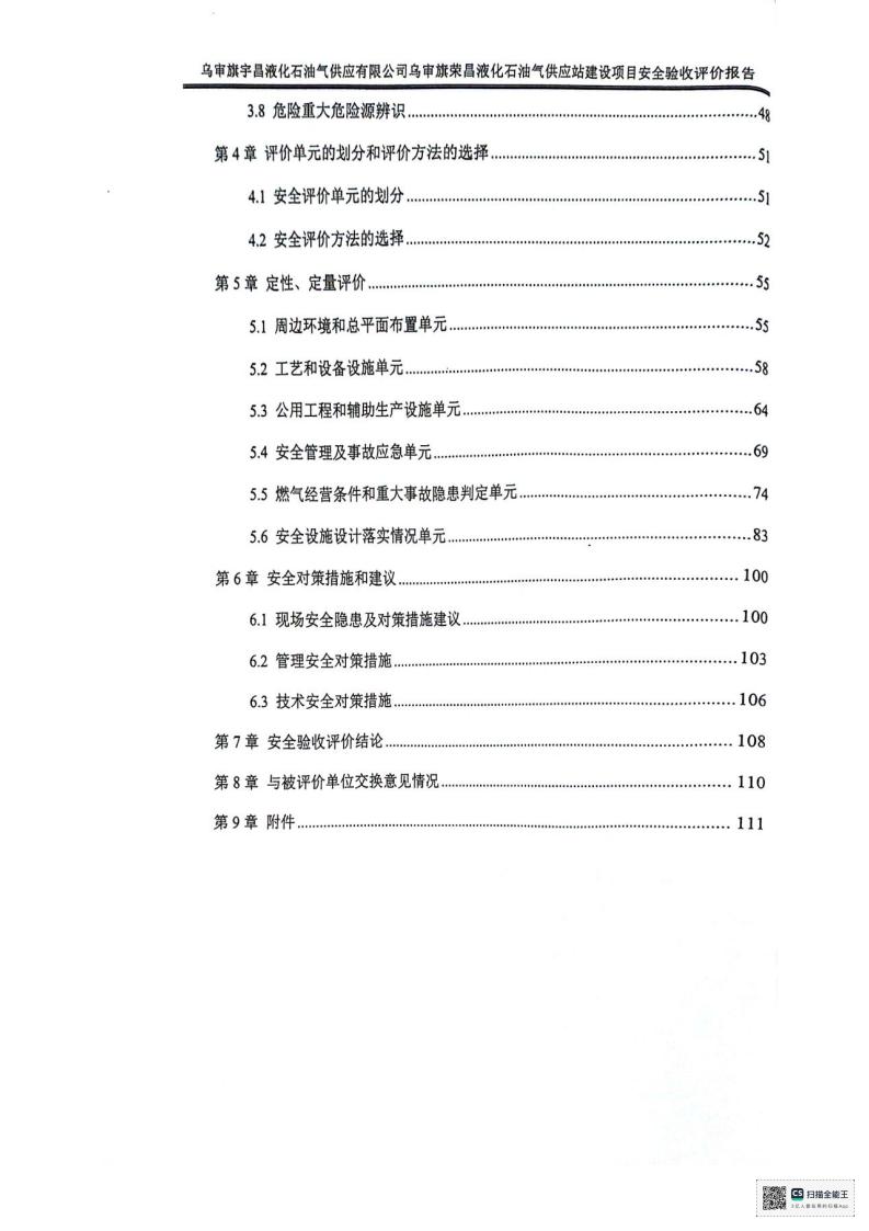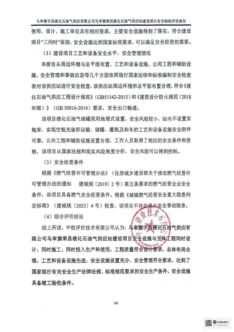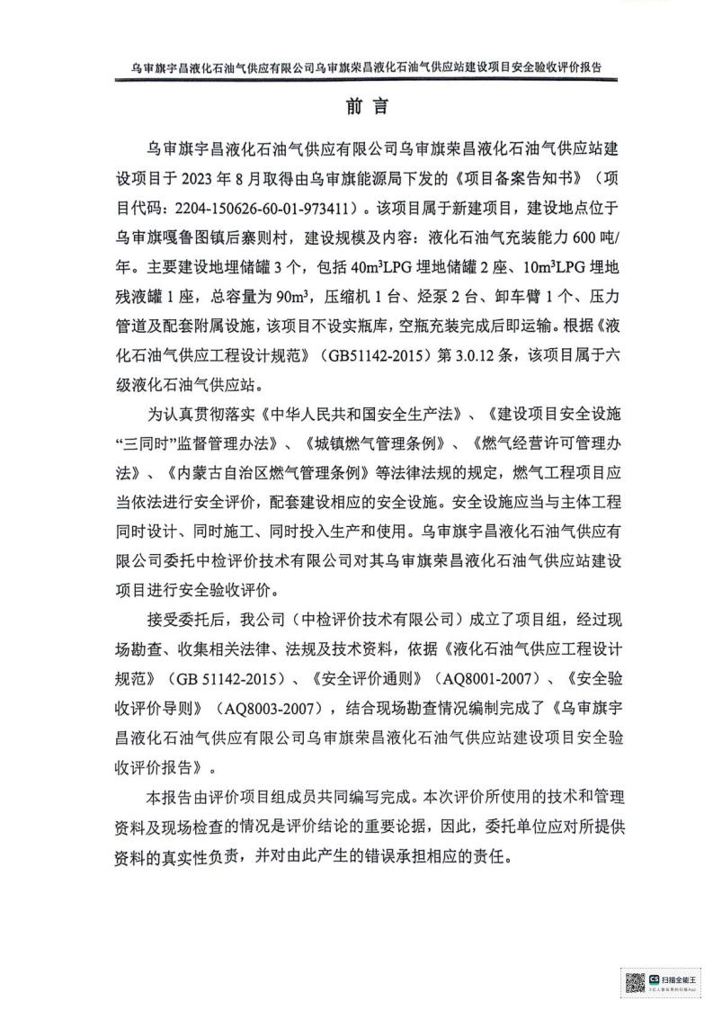 报告结论 | 乌审旗宇昌液化石油气供应有限公司乌审旗荣昌液化石油气供应站建设项目安全设施与主体工程同时设计、同时施工、同时投入生产和使用,工程质量符合设计要求,总体布局合理,工艺和设备设施先进,安全设施设置充分,安全管理符合要求,达到了国家现行有关安全生产法律法规、标准规范要求的安全生产条件,安全设施具备竣工验收条件。 | ||||||