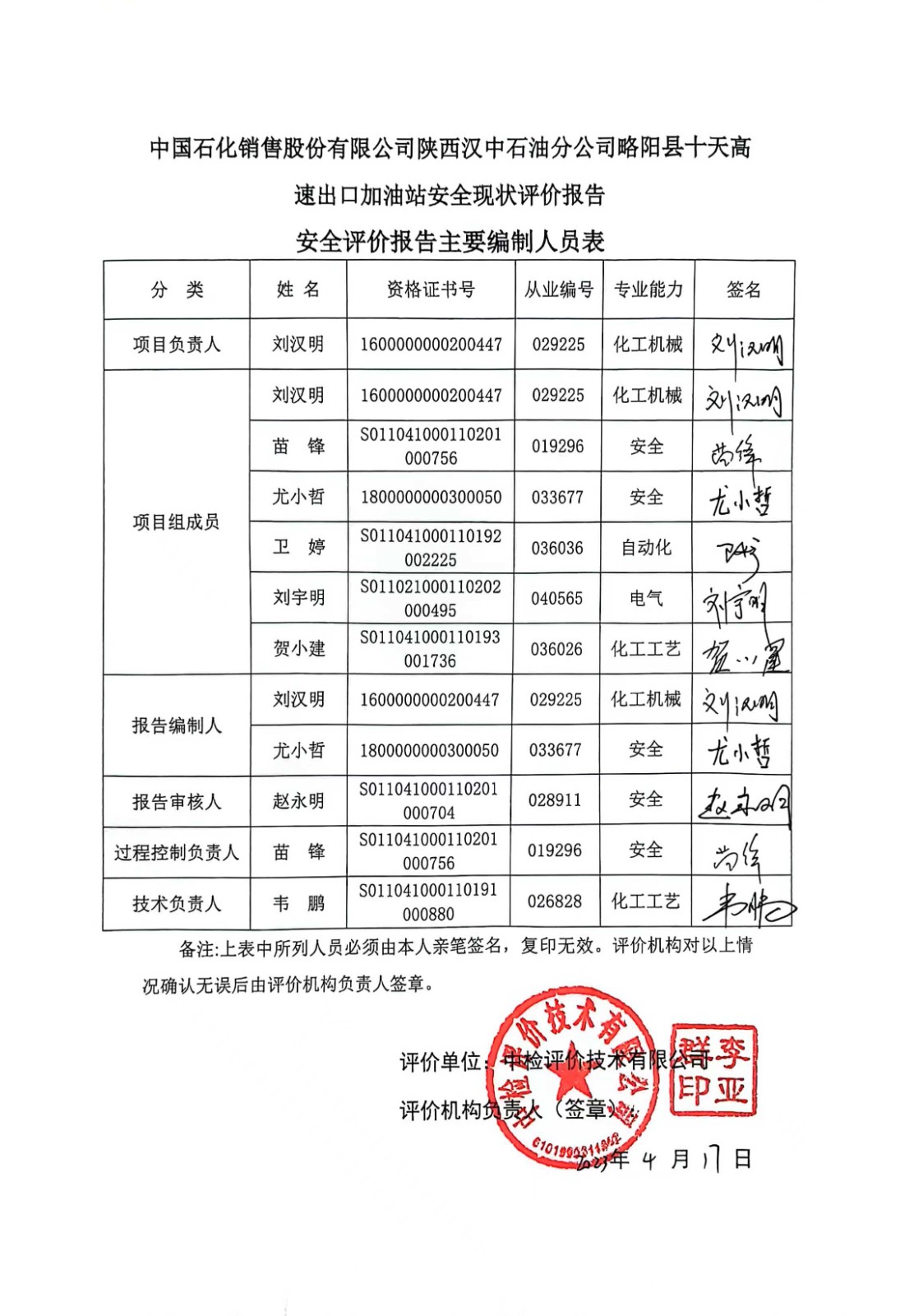 安全评价项目管理 | 项目组长 | 技术负责人 | 过程控制负责人 | ||||