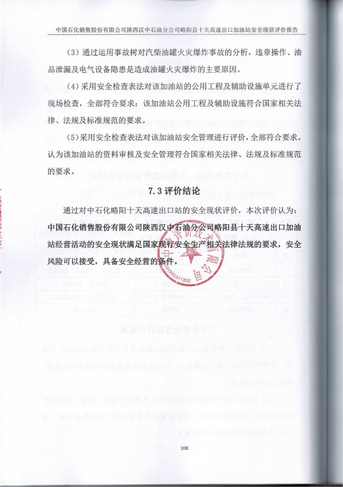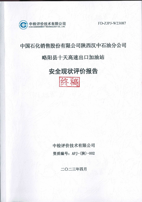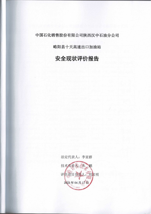 报告结论 | 本次安全现状评价的结论为:中国石化销售股份有限公司陕西汉中石油分公司略阳县十天高速出口加油站的安全现状满足经营活动,安全风险可以接受,具备安全经营条件。 | ||||||