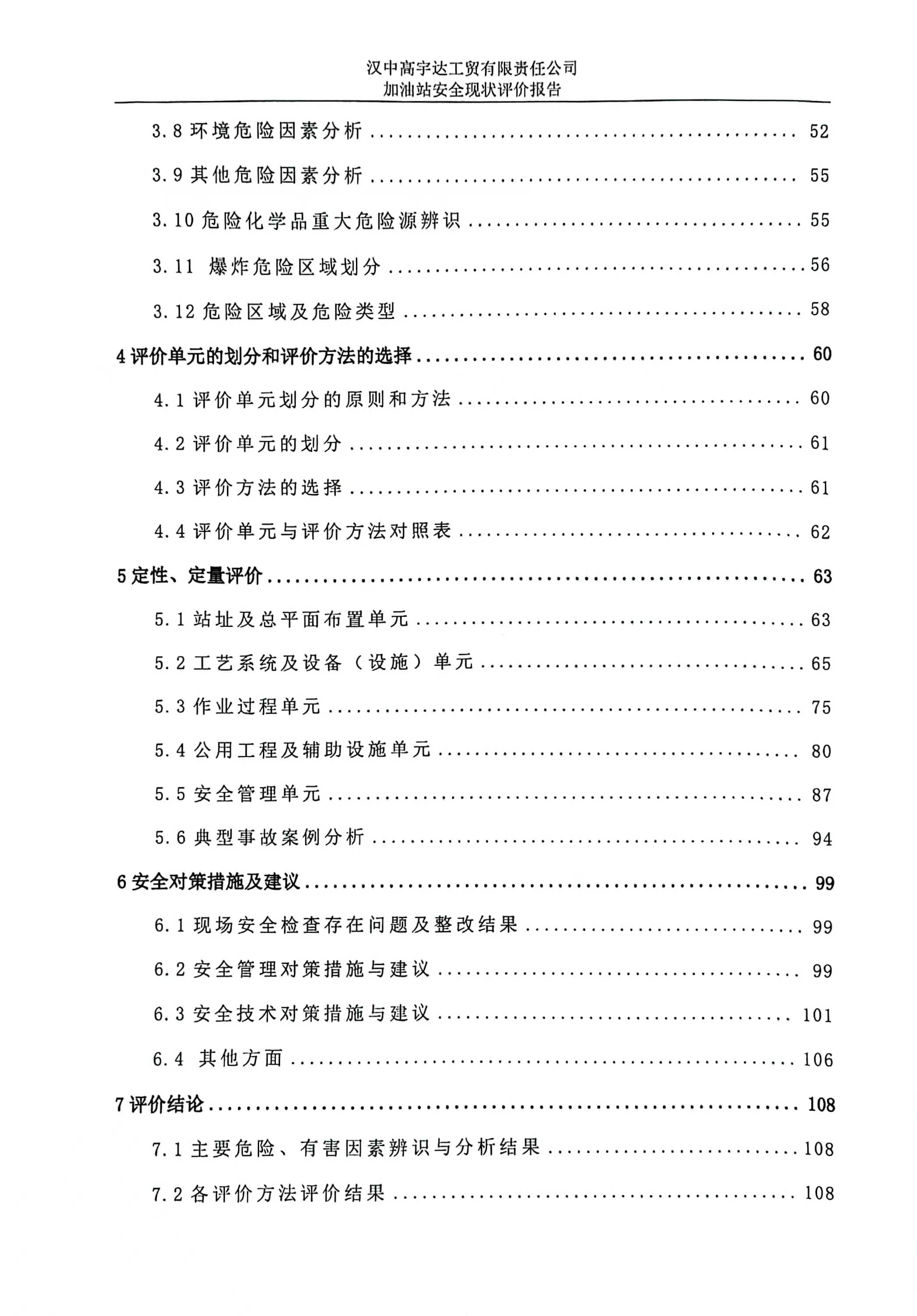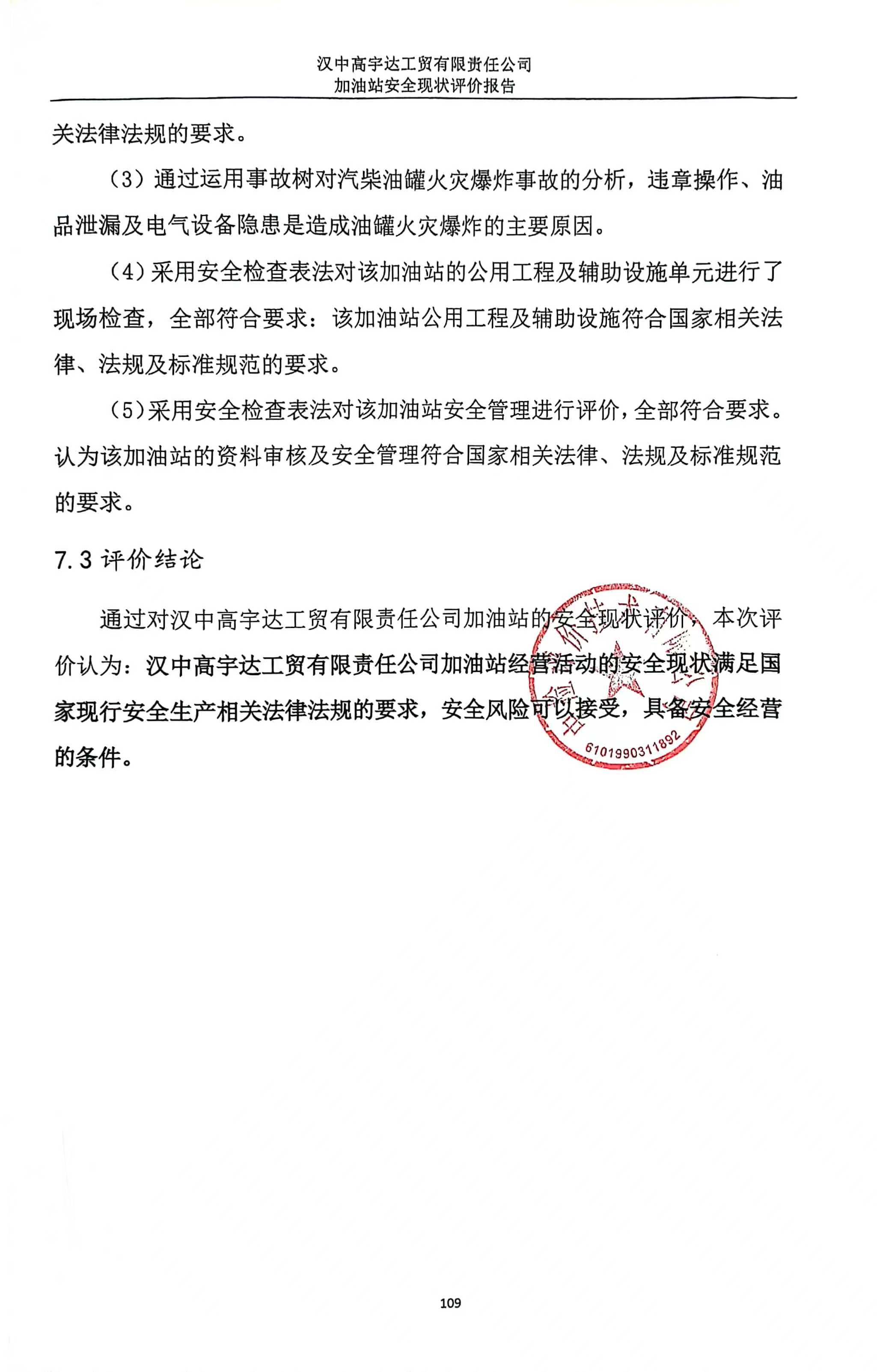 报告结论 | 本次安全现状评价的结论为:汉中高宇达工贸有限责任公司加油站的安全现状满足经营活动,安全风险可以接受,具备安全经营条件。 | ||||||