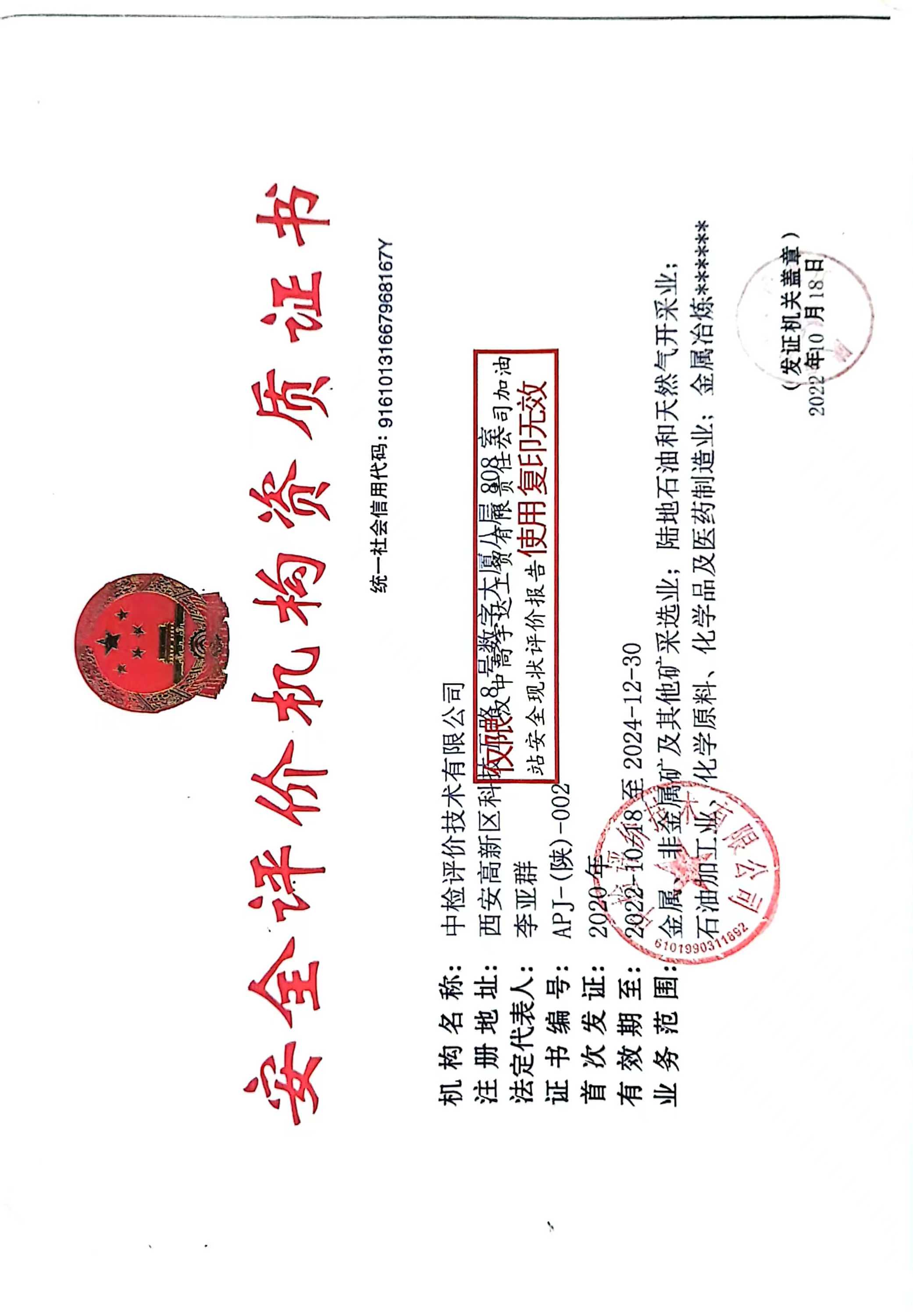 机构名称 | 中检评价技术有限公司 | 资质证号 | APJ-(陕)-002 | ||||