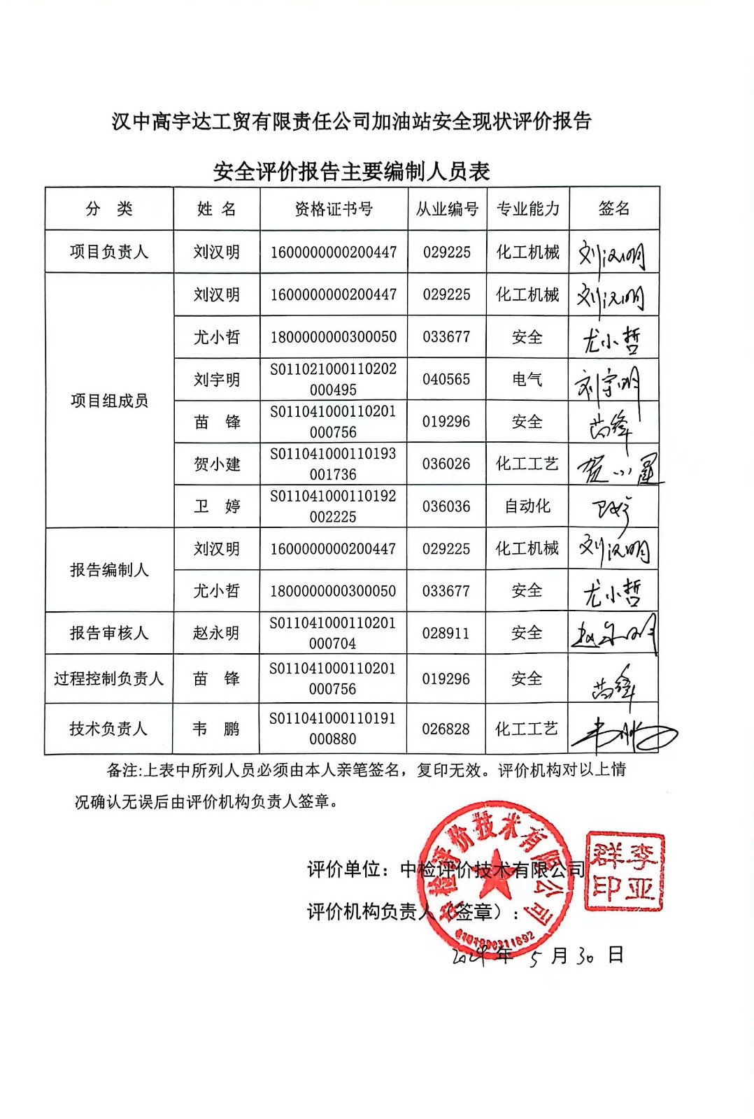 安全评价项目管理 | 项目组长 | 技术负责人 | 过程控制负责人 | ||||
