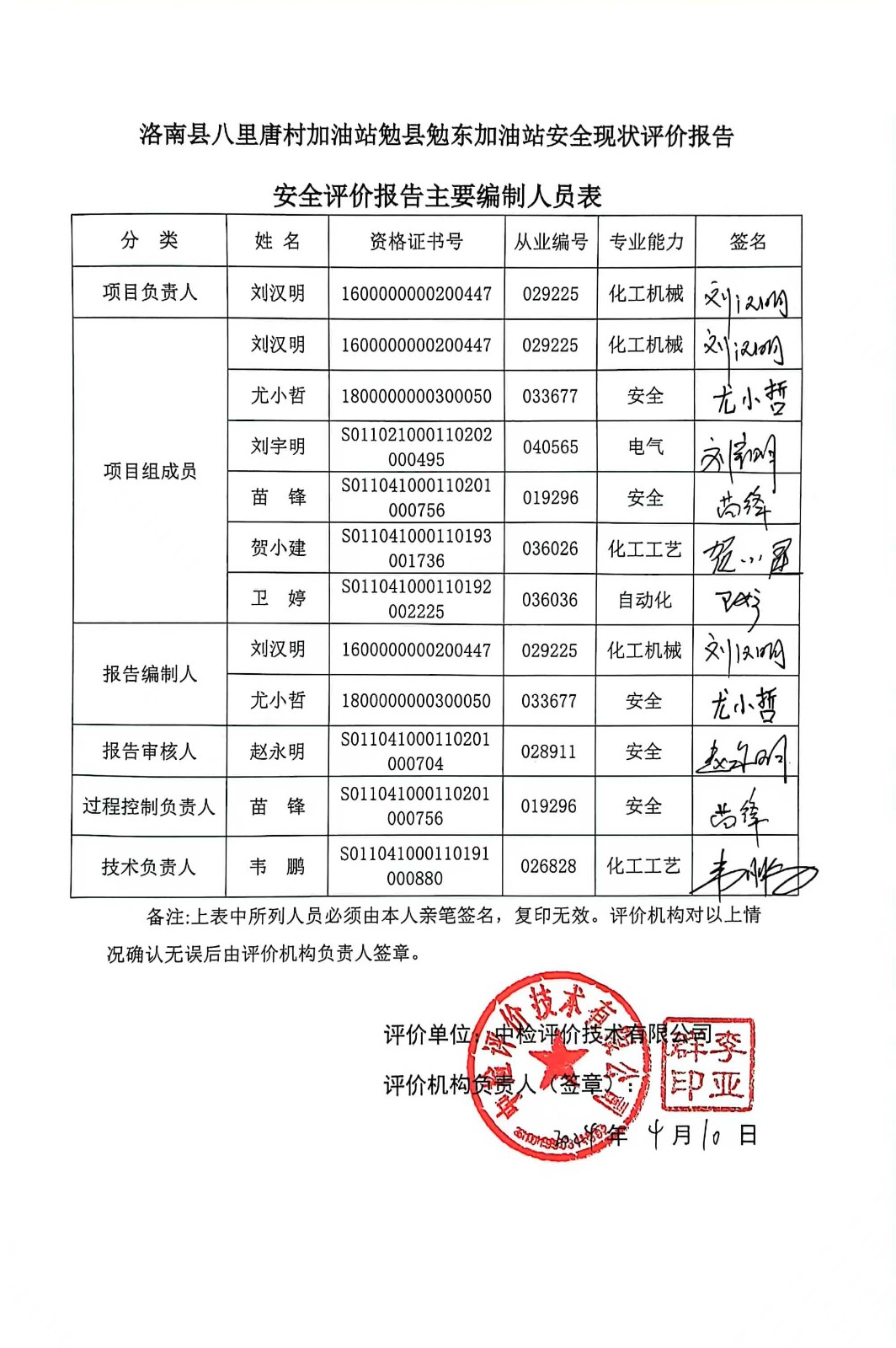 安全评价项目管理 | 项目组长 | 技术负责人 | 过程控制负责人 | ||||