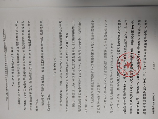 报告结论 | 评价组认为,中国石油天然气股份有限公司云南曲靖销售分公司恩洪加油站安全现状经营条件符合《中华人民共和国安全生产法》(中华人民共和国主席令第88 号)《险化品安全例》国院第591号2011年12月1日起施行,2013国院第645号修改《险化学品经营许可证管理办法》(2012年7月17日国家安全监管总局令第55号公布根据2015年5月27日国家安全监管总局第79号修)《汽加油加气加站技术标准》(GB50156-2021)等国家有关安全方面的法律、法规、规章、标准和规范的要求。 | ||||||