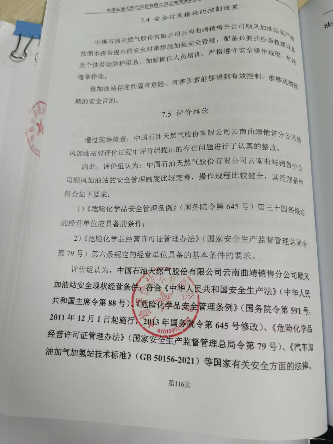 报告结论 | 中国石油天然气股份有限公司云南曲靖销售分公司顺风加油站安全现状经营条件,符合《中华人民共和国安全生产法》(中华人民共和国主席令第88号)、《危险化学品安全管理条例》(国务院令第591号,2011年12月1日起施行,2013年国务院令第645号修改)、《危险化学品经营许可证管理办法》(国家安全生产监督管理总局令第79号)、《汽车加油加气加氢站技术标准》(GB 50156-2021)等国家有关安全方面的法律、法规、标准和规范的要求。 | ||||||