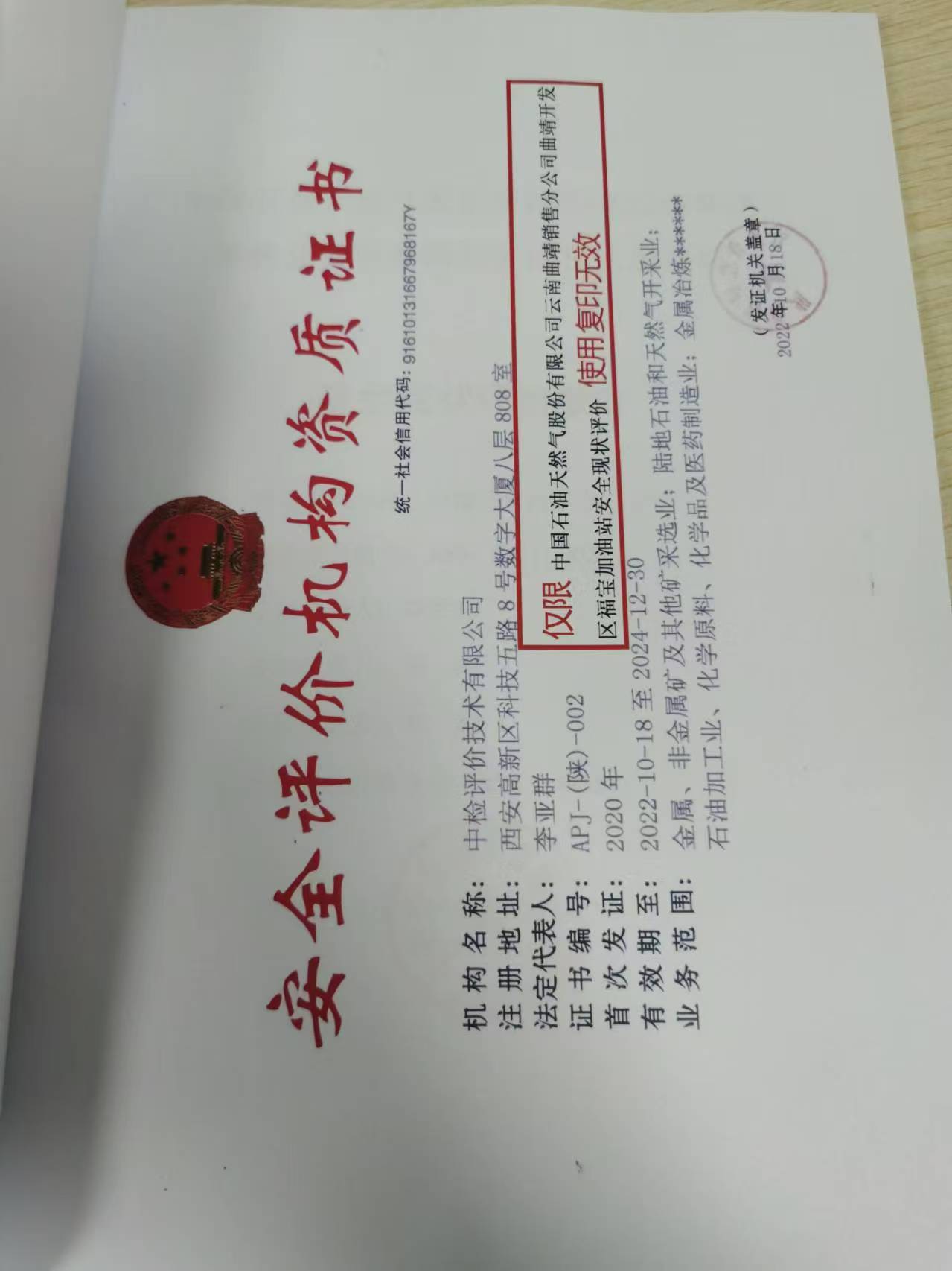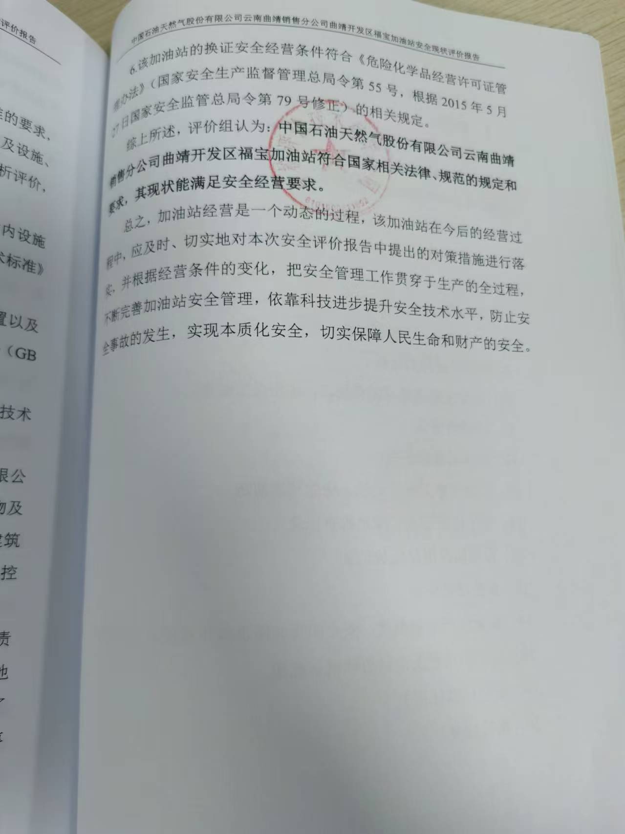 报告结论 | 中国石油天然气股份有限公司云南曲靖销售分公司曲靖开发区福宝加油站符合国家相关法律、规范的规定和要求,其现状能满足安全经营要求。 | ||||||