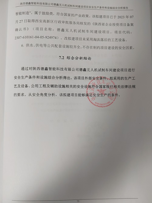 报告结论 | 通过对陕西德鑫智能科技有限公司德鑫无人机试制车间建设项目进行安全生产条件和设施综合分析得出,该项目外部安全条件,拟采用的生产工艺及设备、公用工程及辅助设施相关的安全设施符合国家现行相关法律法规的要求。从安全角度分析,该拟建项目能够满足安全生产的条件。 | ||||||