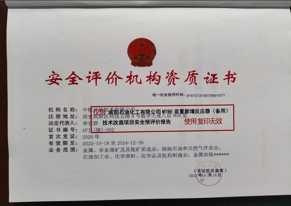 报告结论 | 咸阳石油化工有限公司MTBE装置新增反应器(备用)技术改造项目符合相关标准规范,在项目建设实施过程中,严格落实本安全预评价报告提出的安全对策措施及建议,加强建设项目安全设施“三同时”及安全监督管理工作后,从安全生产角度来看,该项目的安全风险能够达到可以接受的程度。