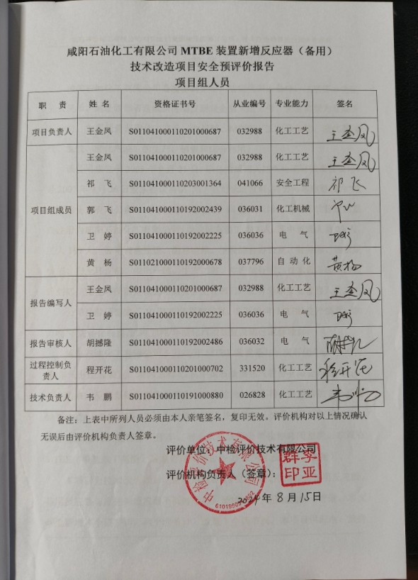项目名称 | 咸阳石油化工有限公司MTBE装置新增反应器(备用)技术改造项目安全预评价报告 | |||||||