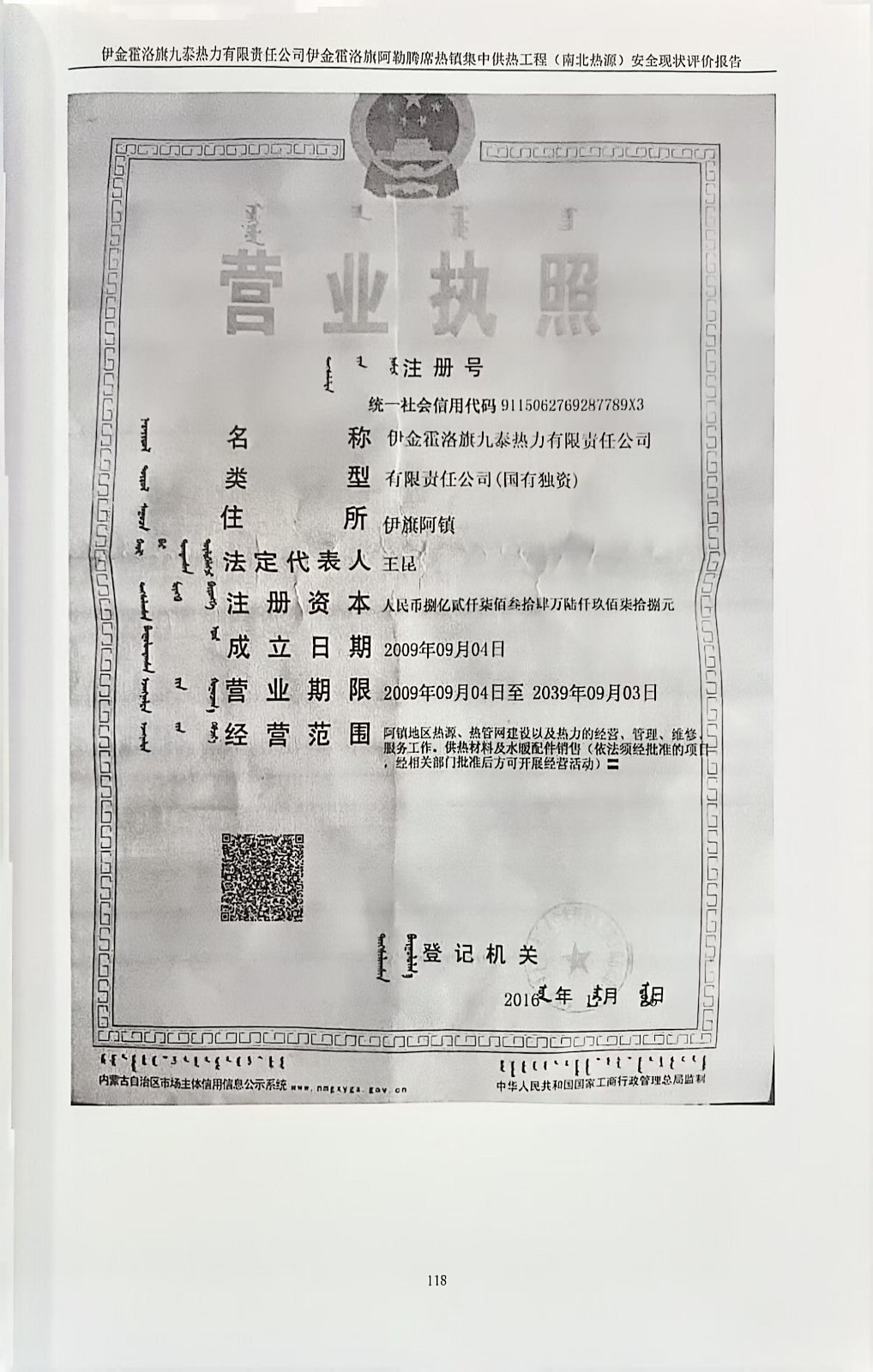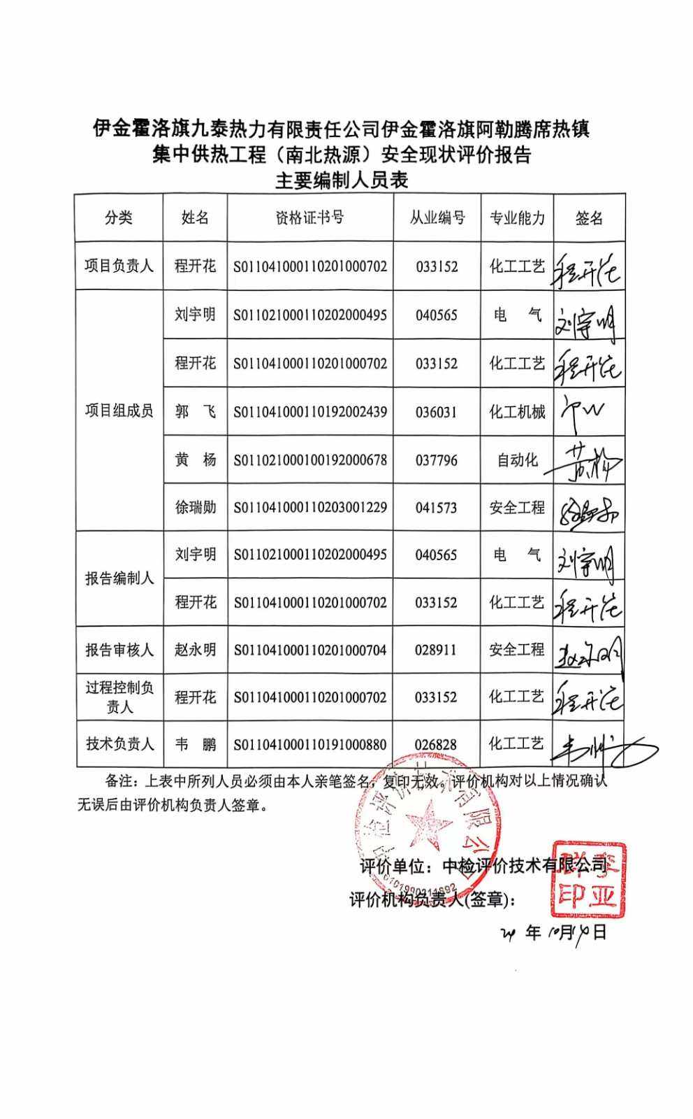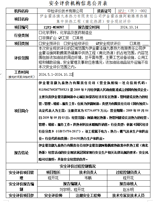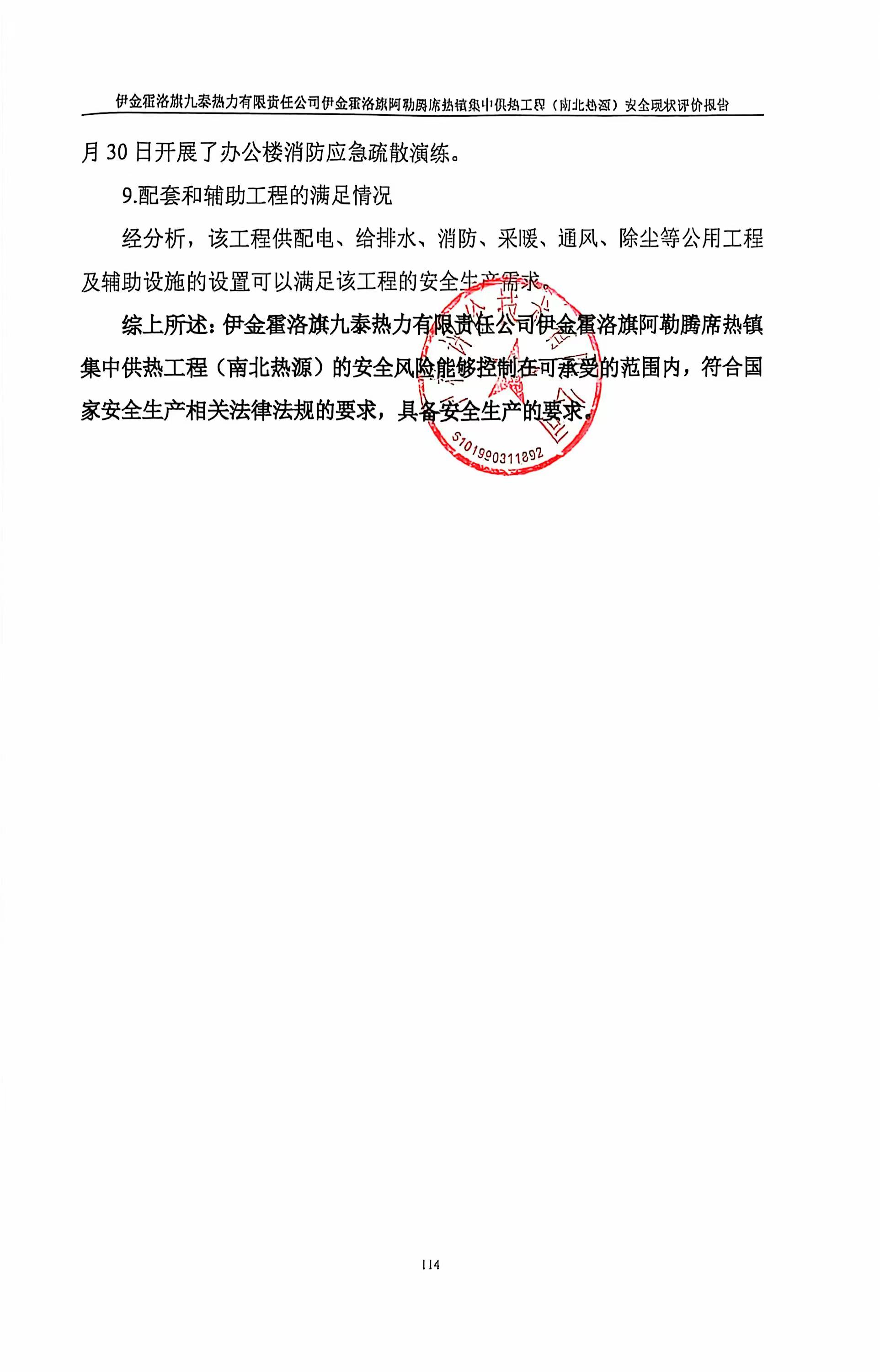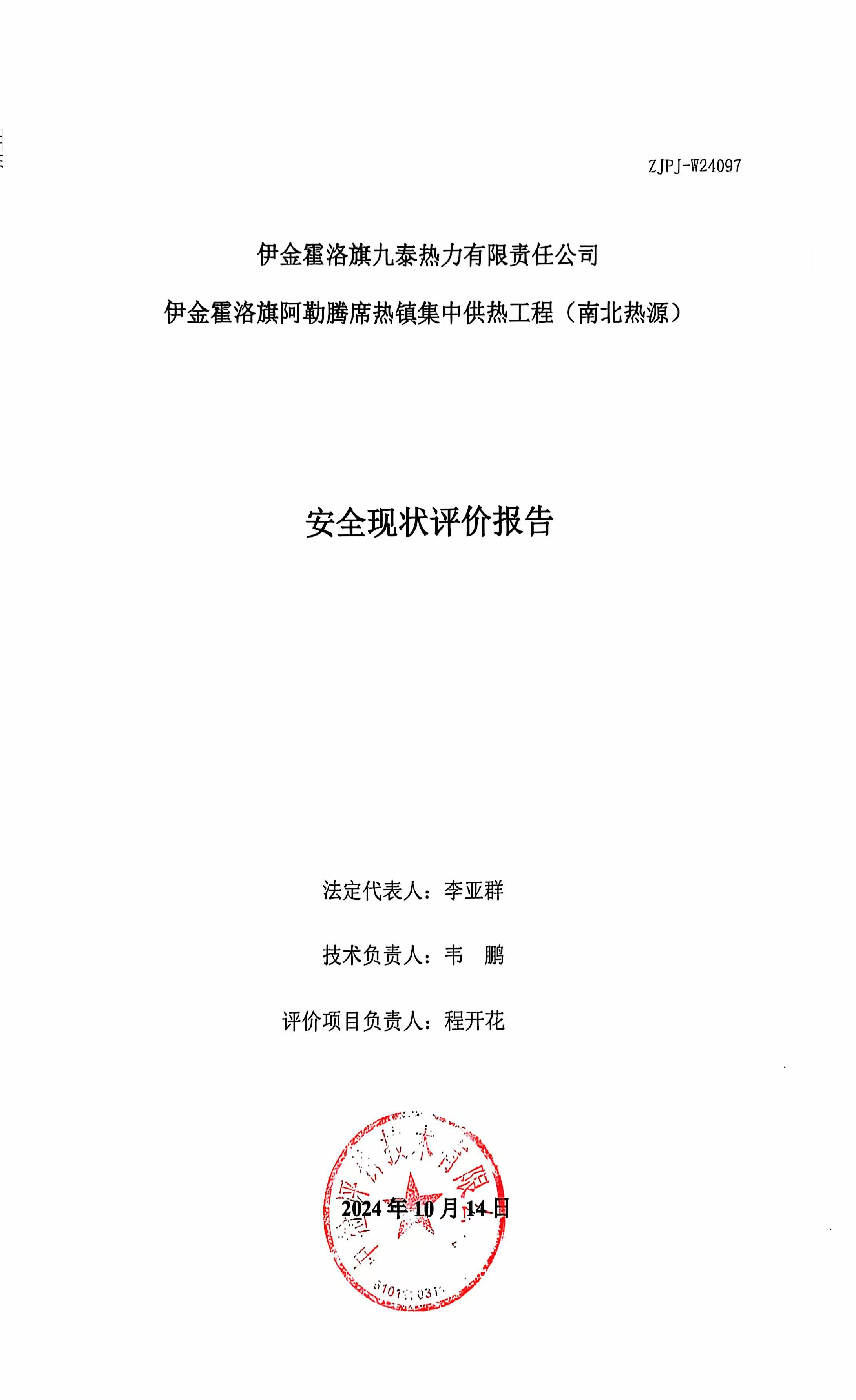 伊金霍洛旗九泰热力有限责任公司伊金霍洛旗阿勒腾席热镇集中供热工程(南北热源)安全现状评价报告