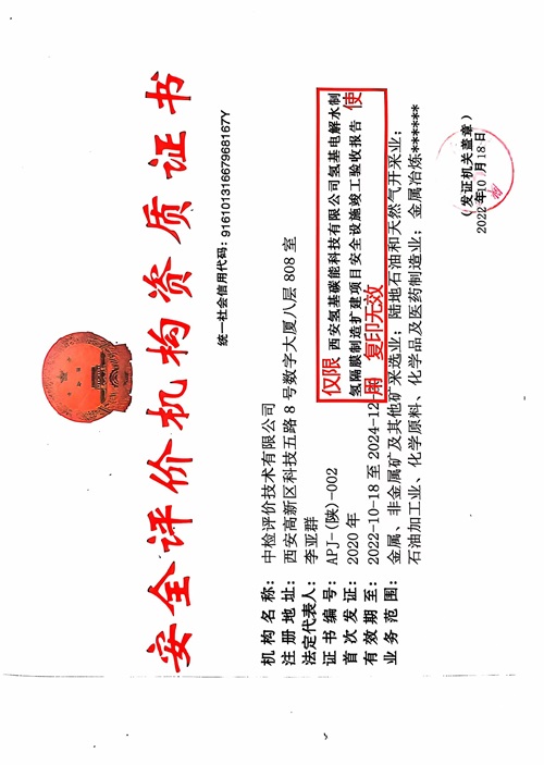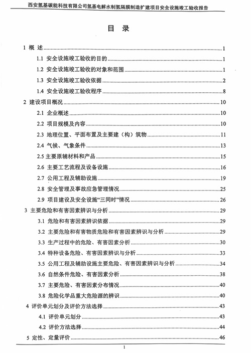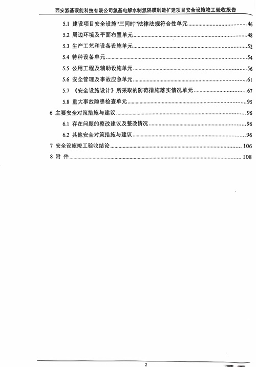 报告结论 | 西安氢基碳能科技有限公司氢基电解水制氢隔膜制造扩建项目的周边环境和平面布置合理,生产工艺和设备设施、公用工程和辅助设施的安全设施设置,安全管理及事故应急等方面符合我国现行相关法律法规的要求,项目试生产运行正常,具备安全设施竣工验收的条件。 | ||||||
