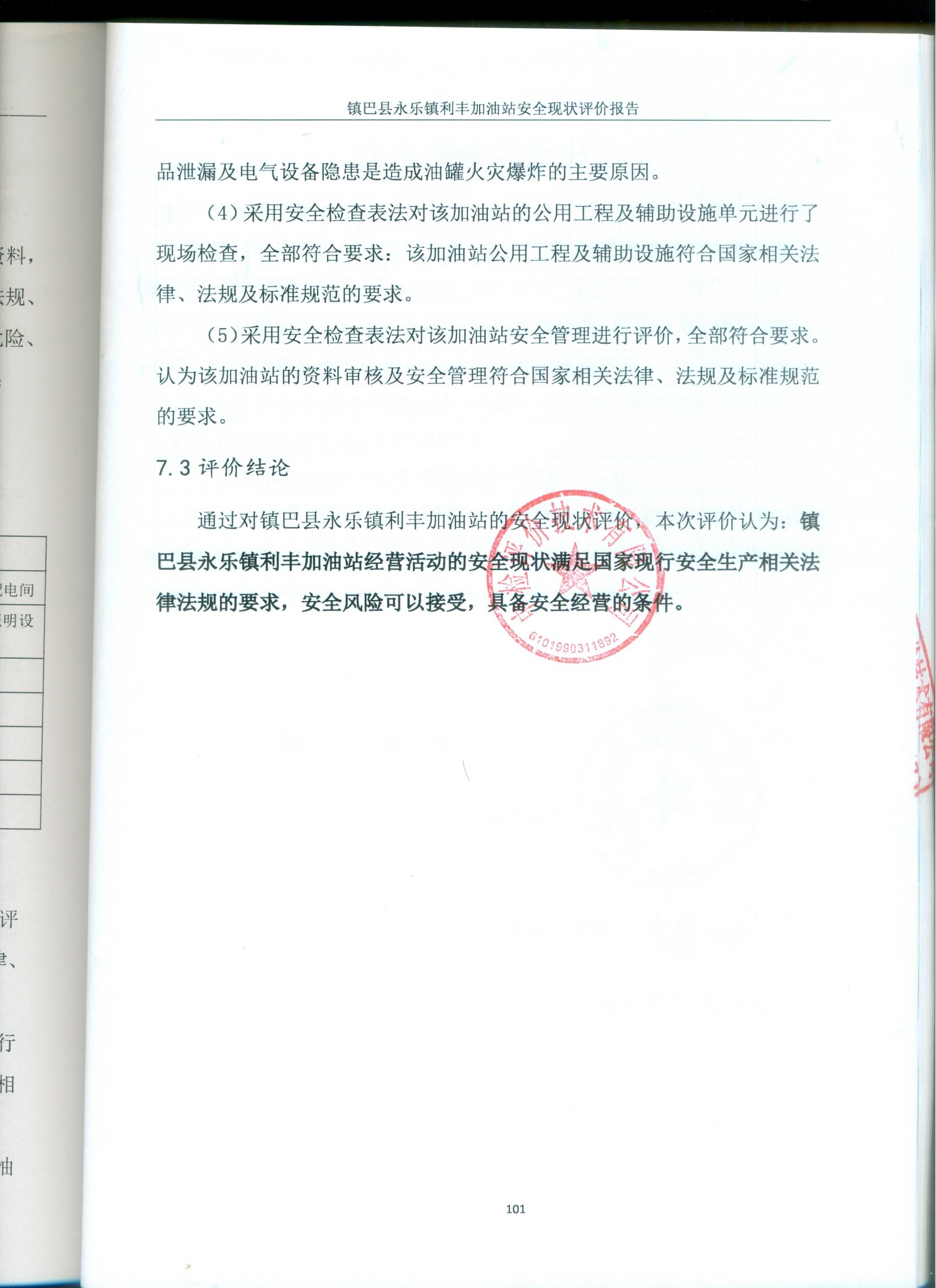 报告结论 | 评价结论:通过对镇巴县永乐镇利丰加油站安全现状评价报告的安全现状评价,本次评价认为:镇巴县永乐镇利丰加油站安全现状评价报告经营活动的安全现状满足国家现行安全生产相关法律法规的要求,安全风险可以接受,具备安全经营的条件。 | |||||||