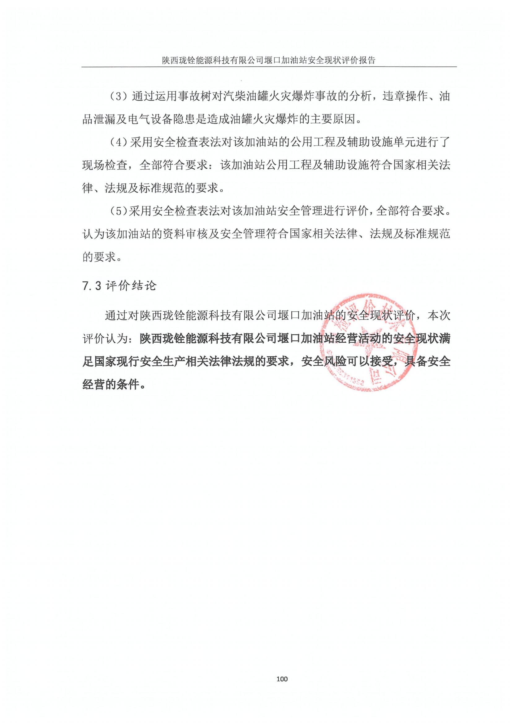 报告结论 | 评价结论:通过对陕西珑铨能源科技有限公司堰口加油站的安全现状评价,本次评价认为:陕西珑铨能源科技有限公司堰口加油站经营活动的安全现状满足国家现行安全生产相关法律法规的要求,安全风险可以接受,具备安全经营的条件。 | ||||||