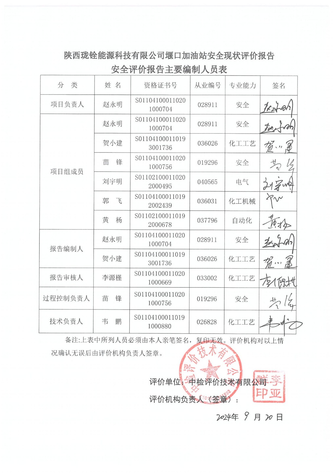 安全评价项目管理 | 项目组长 | 技术负责人 | 过程控制负责人 | ||||