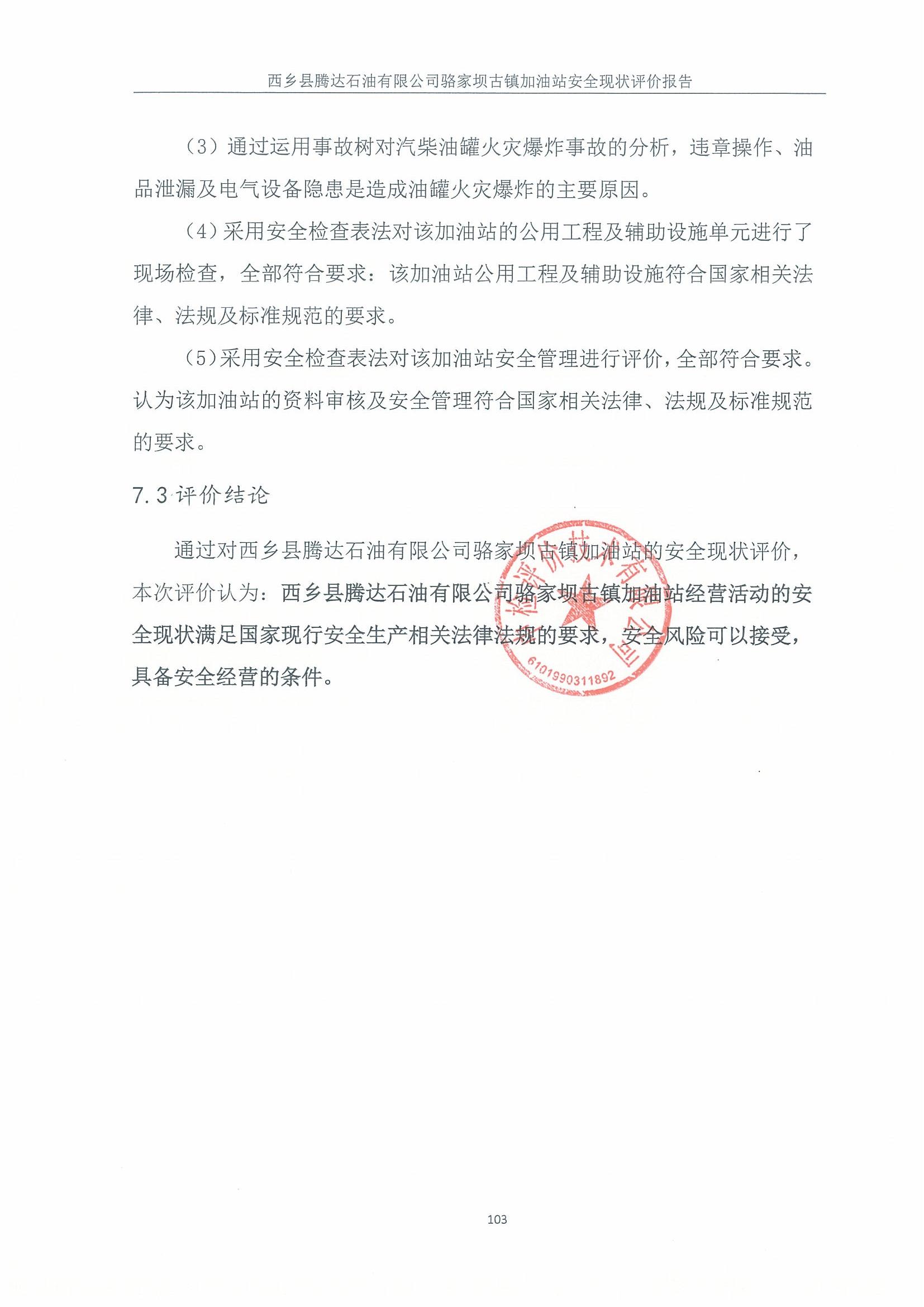 报告结论 | 评价结论:通过对西乡县腾达石油有限公司骆家坝古镇加油站的安全现状评价,本次评价认为:西乡县腾达石油有限公司骆家坝古镇加油站经营活动的安全现状满足国家现行安全生产相关法律法规的要求,安全风险可以接受,具备安全经营的条件。 | ||||||