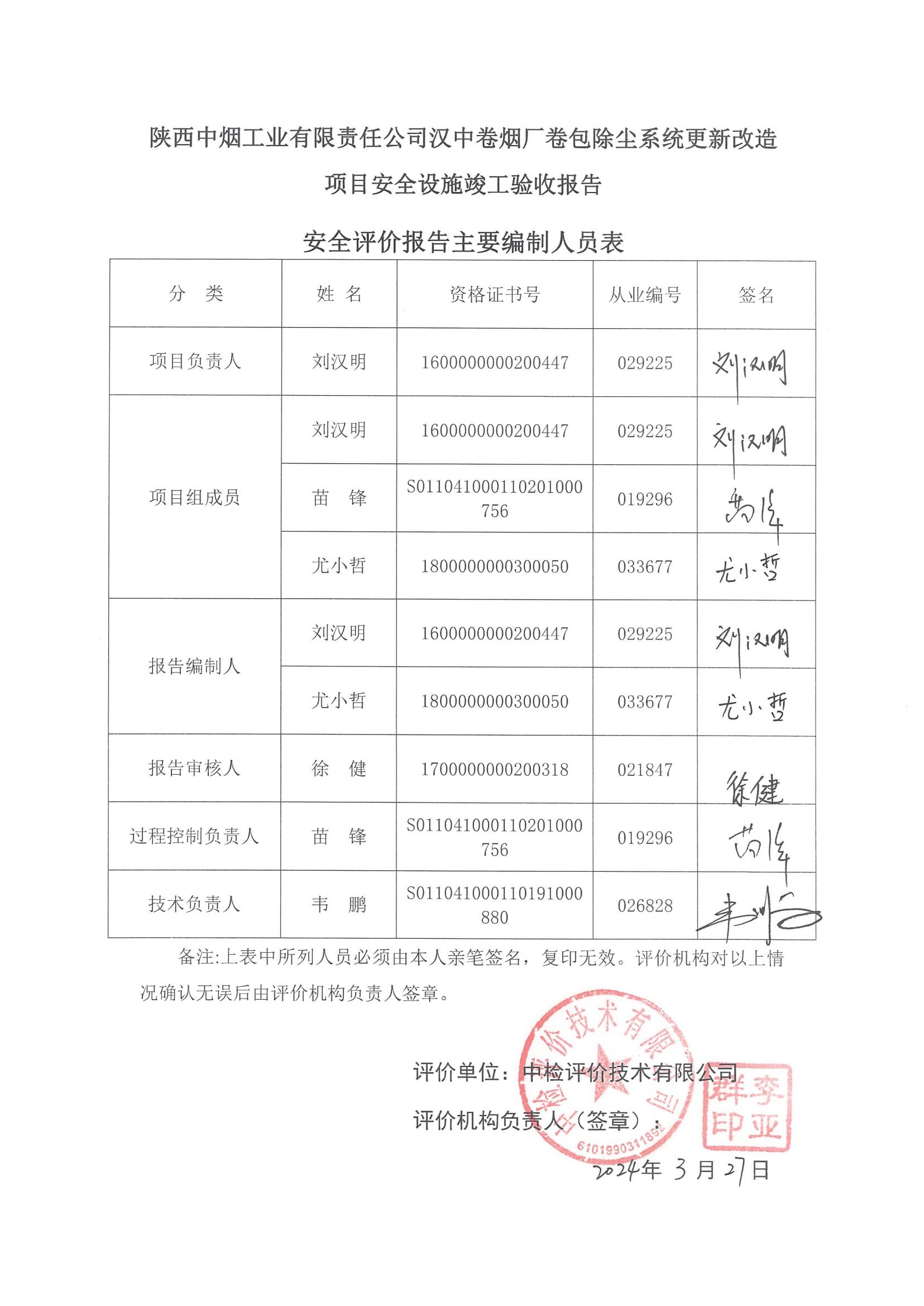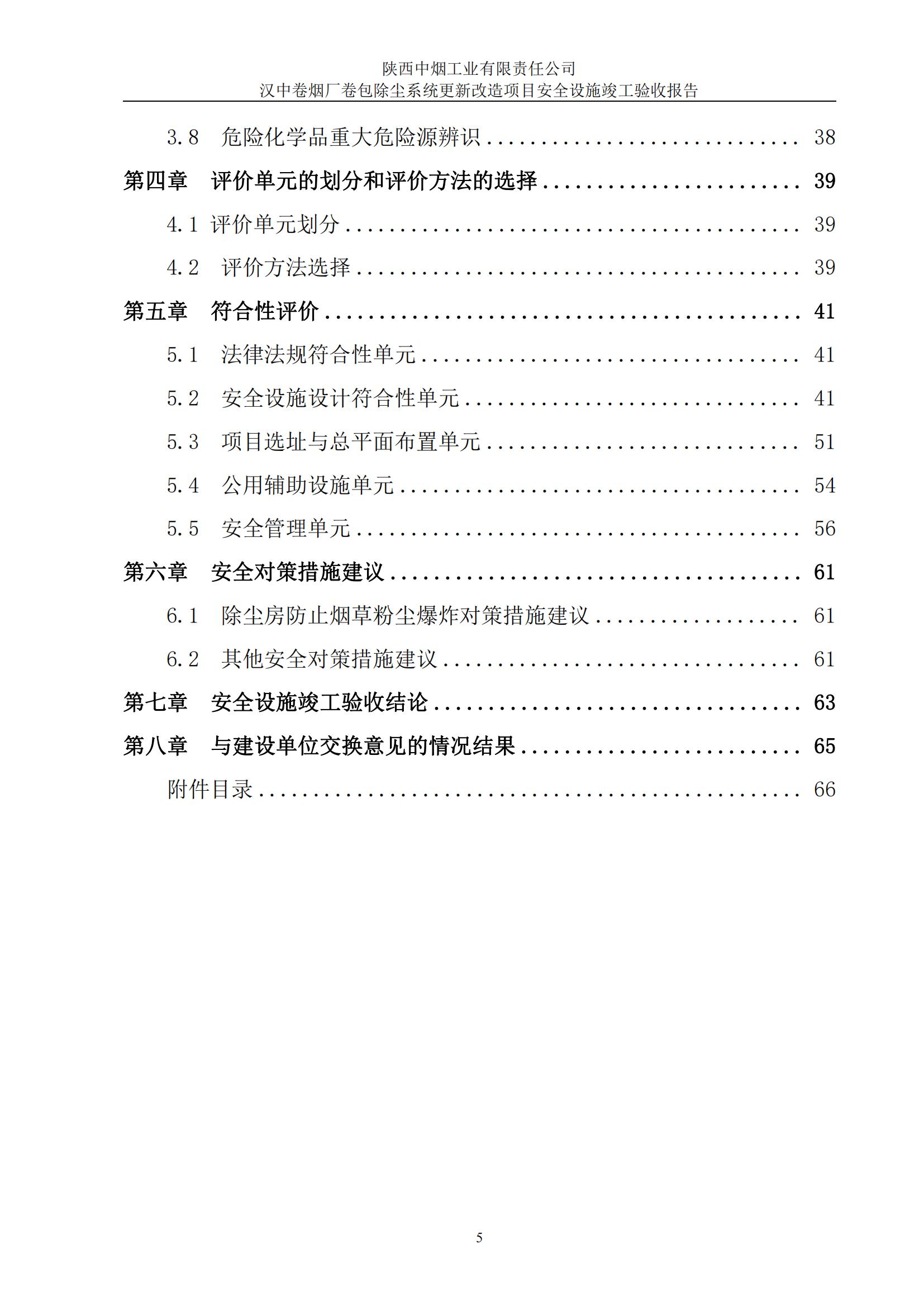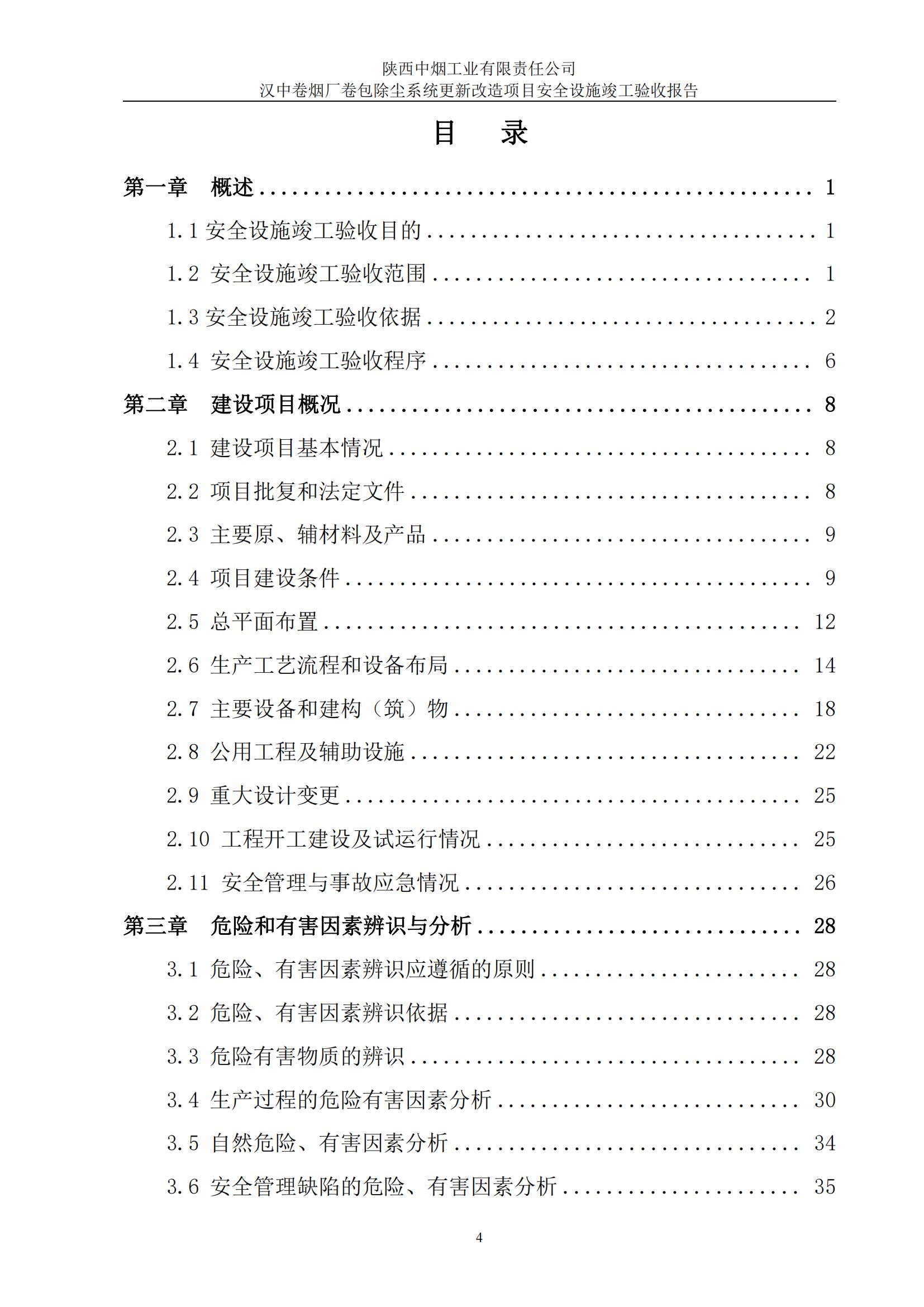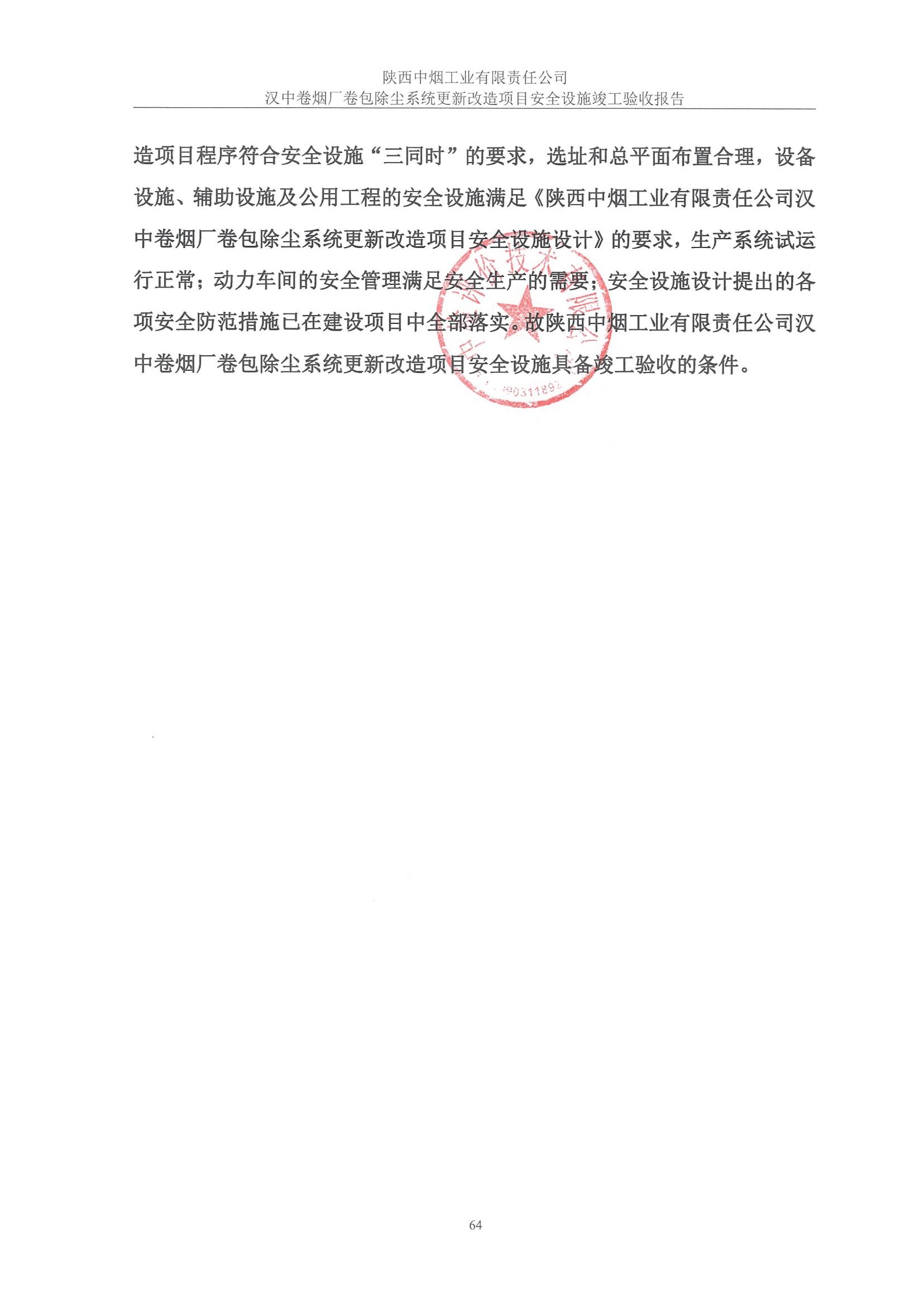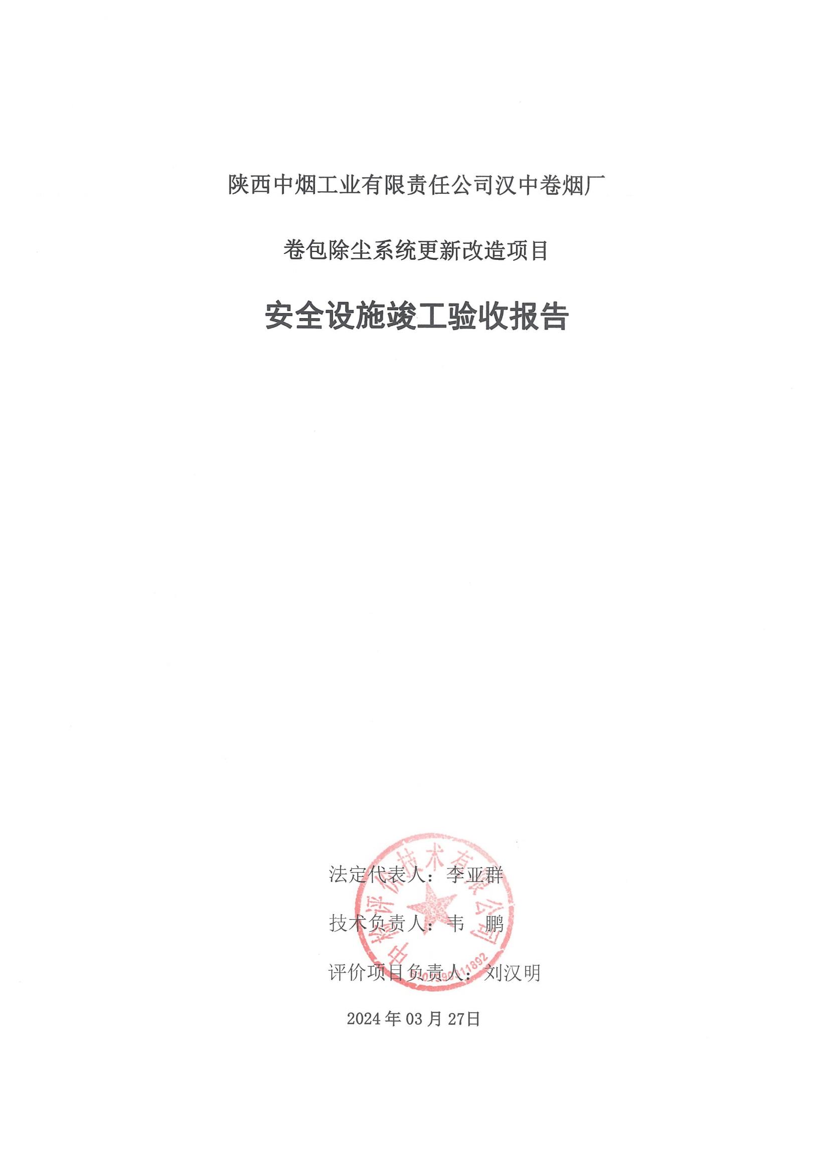 项目名称 | 陕西中烟工业有限责任公司 汉中卷烟厂卷包除尘系统更新改造项目安全设施竣工验收报告 | ||||||