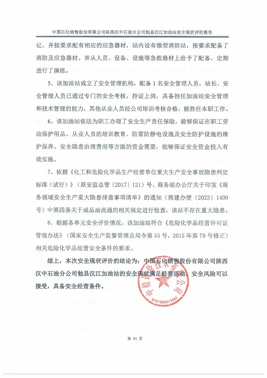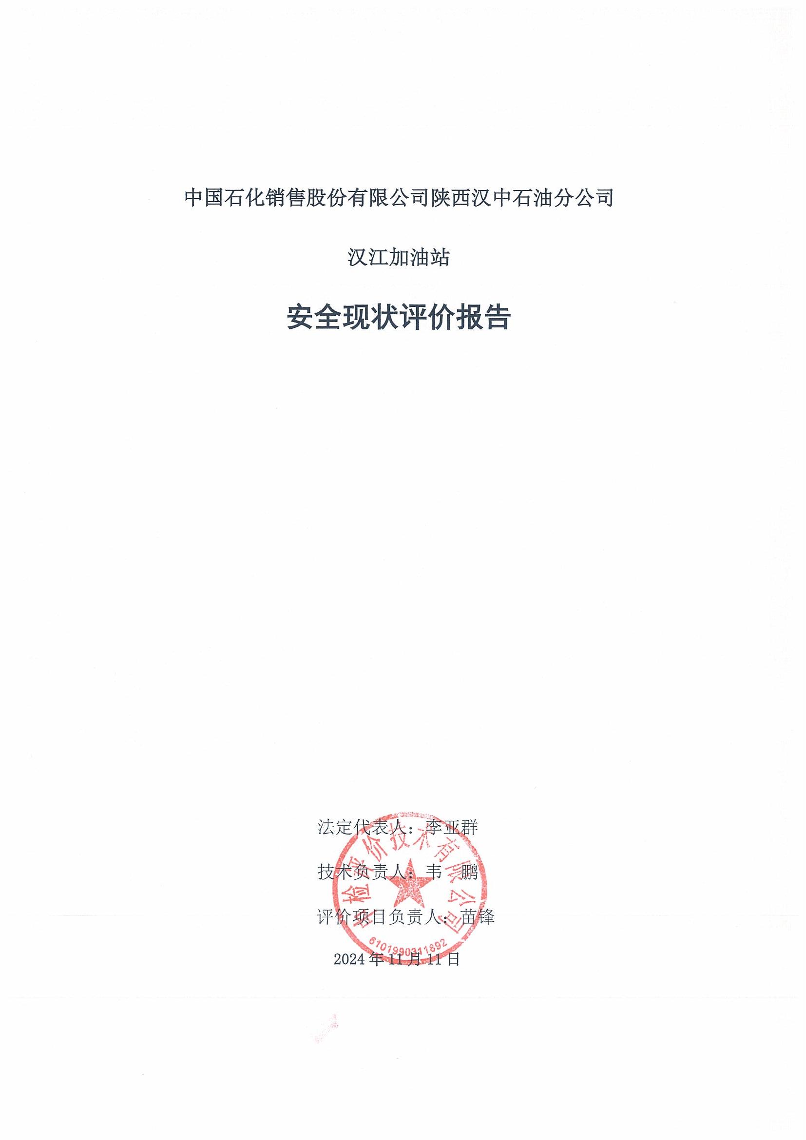 报告结论 | 本次安全现状评价的结论为:中国石化销售股份有限公司陕西汉中石油分公司勉县汉江加油站的安全现状满足经营活动,安全风险可以接受,具备安全经营条件。 | ||||||